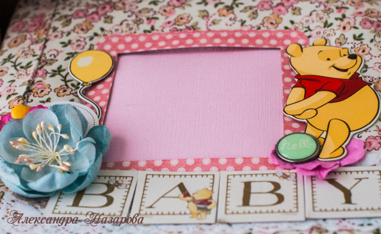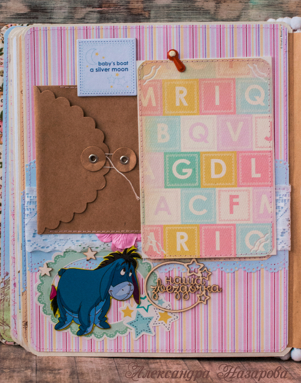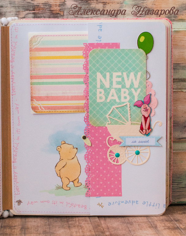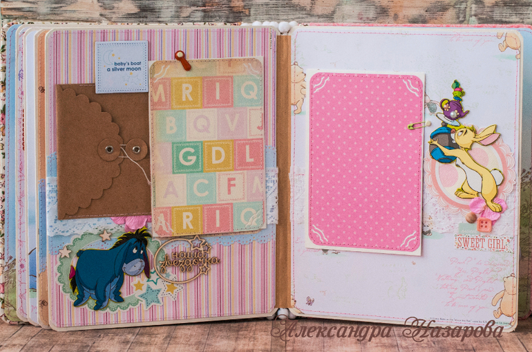 Ура!! Сразу расскажу про альбом. Альбомчик 20-25 см мой любимый размер, 5 листов, вместит 30 самых лучших фото с первого года малышки! Есть милые надписи, герои мультика Винни пух) Еще есть 2 больших акриловых кармана, конверт для амятных вещей например фото узи.