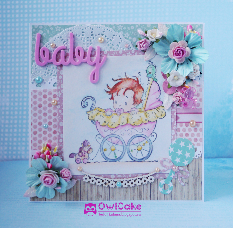 Цветы для настоящей девочки, первая погремушечка и даже розовый медвежонок, украшают открыточку.