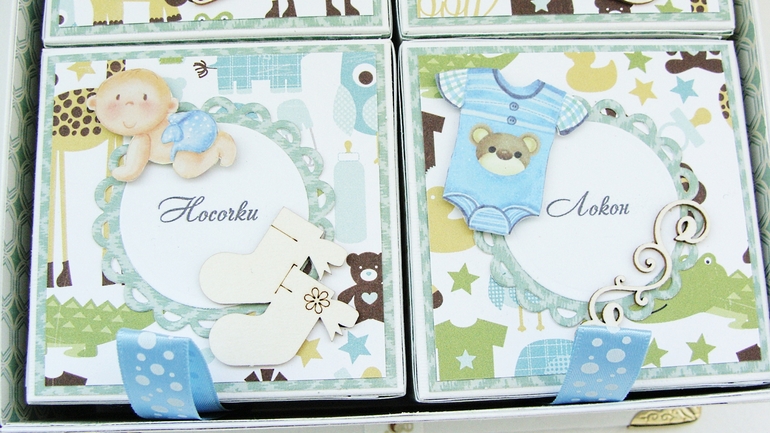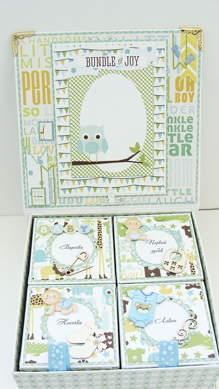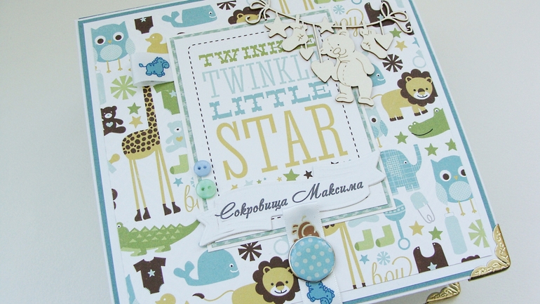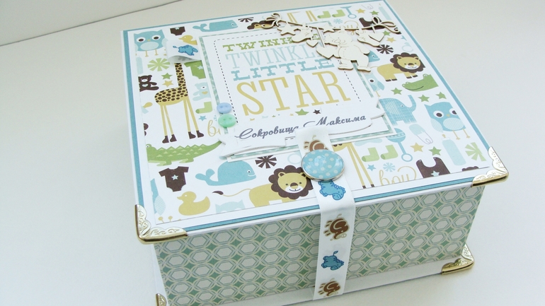 Коробки, шкатулки, комодыНаверно, сокровища по своему количеству здесь на ББ побили уже всякие рекорды, но что тут поделаешь, если их заказывают и их хочется делать. Детские работы я вообще обожаю делать. А еще, бывают такие заказы душевные заказчики, что хочется сразу браться за заказ. Бумага использована самая разная: здесь и Bundle of joy, и остатки набора Lucy Cromwell, и совсем новый набор от DSWV Little Mister (мне набор очень понравился: бумага плотная, цвета прям мальчишичьи, вырубки нет, но есть карточки в наборе), + польский чипборд. А еще я обошлась без всяких там ленточек-завязочек (все-таки мальчик) - коробочка закрывается на магнитик, который спрятан под брадсик и вторая часть "вмонтирована" в верхнюю стеночку коробочки, в общем все красиво, ничего не видно. А еще маленький Максим родился со мной в один день, поэтому делать коробочку вдвойне приятно. Показываю...