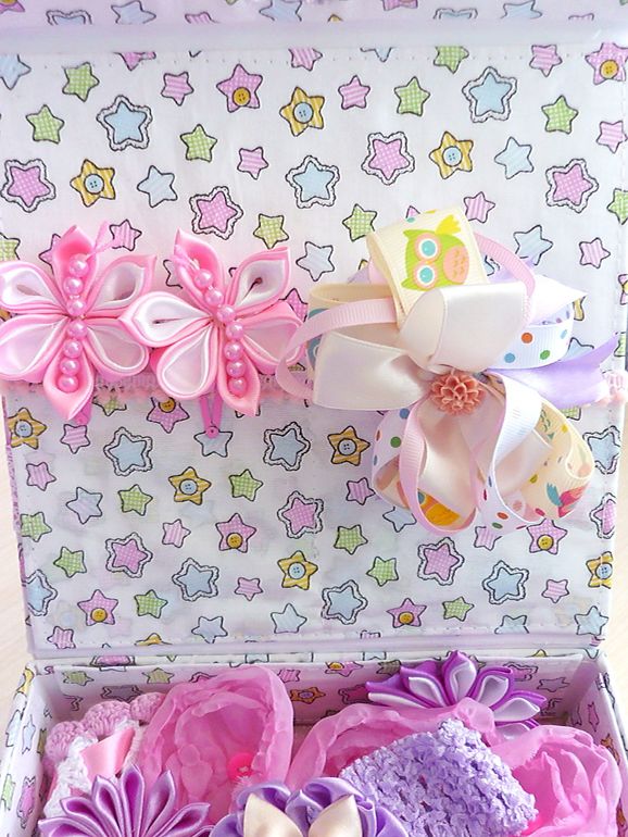 Коробки, шкатулки, комодыДобрый день. Последнее время на нашем любимом сайте вижу делают коробочки для заколочек, бантиков. Я решила не отставать и сделала коробочку для Сашеньки. Пока в нашем арсенале аксессуаров для волос повязочки и канзашки, но к лету наряжу свою принцессу по полной программе.Решила ко всем сшитым мною платьишкам сделать заколочки и бантики из фоамирана, тк увлеклась им. Что то я много болтаю... вот мой двухдневный труд.