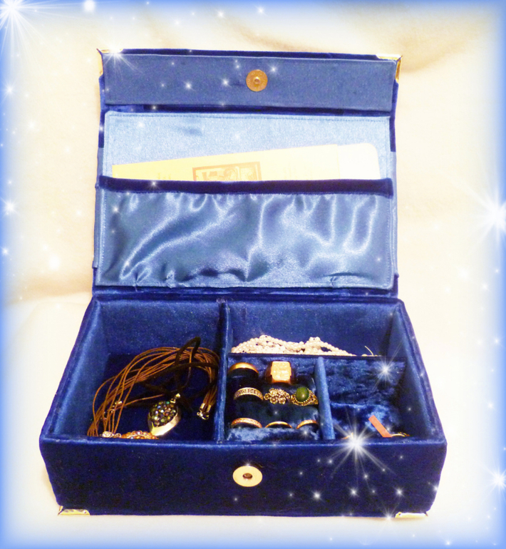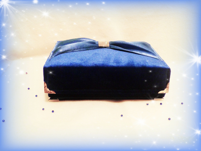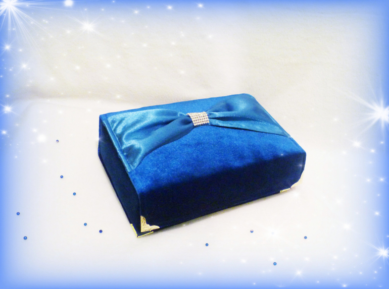 Обтянута синим бархатом. Внутри атлас и бархат другого оттенка.