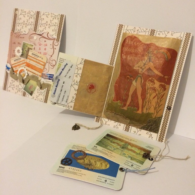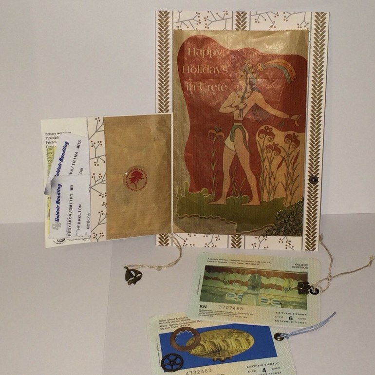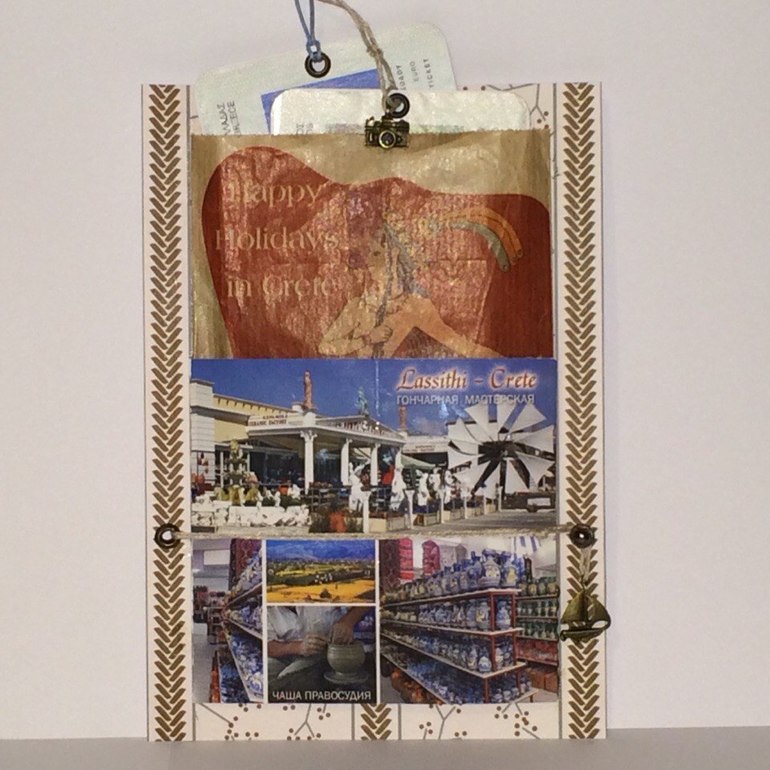Древний грек на кирпчином фоне это упаковочный кулечек от сувенирной продукции. Здесь он - карман для всяких памятных вещиц: на тегах входные билеты в музеи и проч.