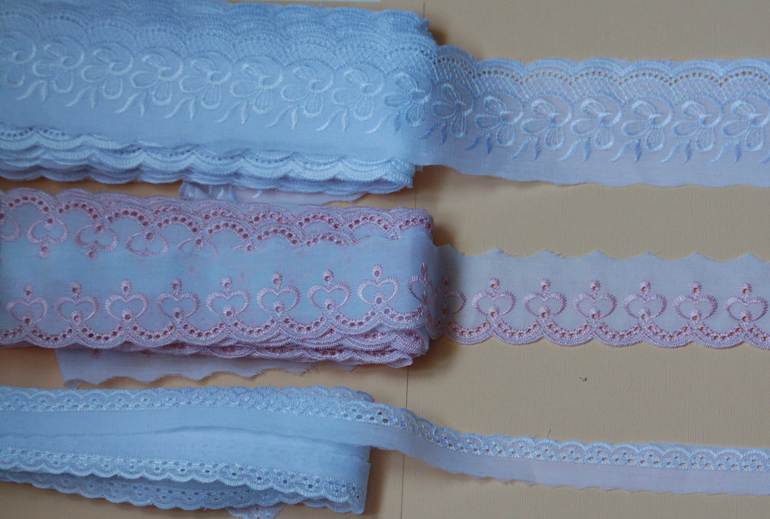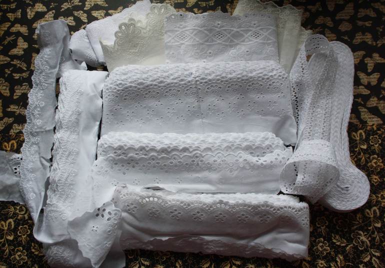 Шитье. Ух сколько же я его искала, чтобы качество было нормальное, вышивка не синтетическая, без ужасного блеска. Обожглась недавно на российском шитье. Сравните на втором фото сами, это российско шитье - в принципе неплохое, но выглядит не так роскошно. Правда у него есть одно преимущество - оно в три раза дешевле корейского. Качество для меня было в приоритете, поэтому я искала подороже и посолидней. Сначала заглядывалась на кружева с алиэкспресс, но у китайцев везде основа хлопковая, а вышивка полиэстер. Мне же подавай только полный Cotton. есть конечно и на али неплохое кружево, но зная любовь китайцев показывать на картинке одно, а присылать другое, я не стала рисковать и сделала покупку на Etsy. Чему очень рада.