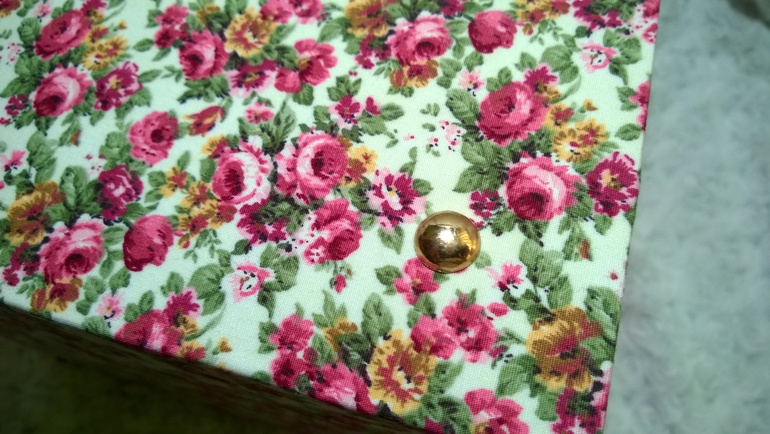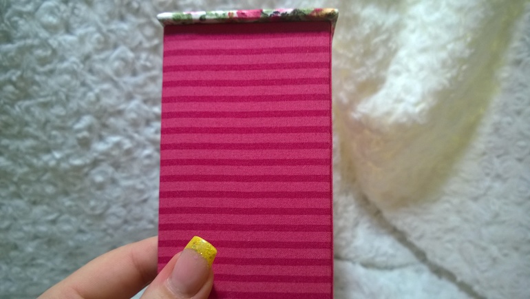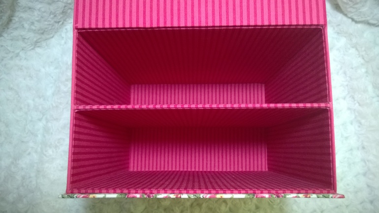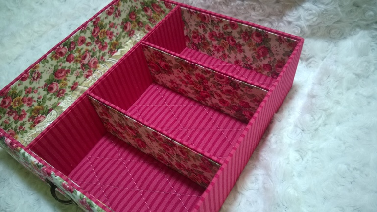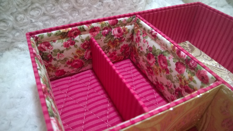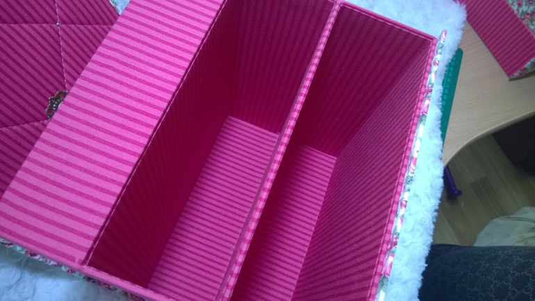 Сам корпус из 2 мм картона. Синтепоном прослоила только 2 детальки где ручки и верх крышки, на всех остальных деталях ткань приклеена на ПВА (ушло 600 мл). Весьма тяжело было работать с тканью в полоску, очень переживала, чтобы полоски в сторону не съехали.