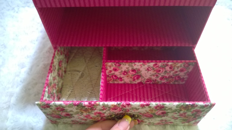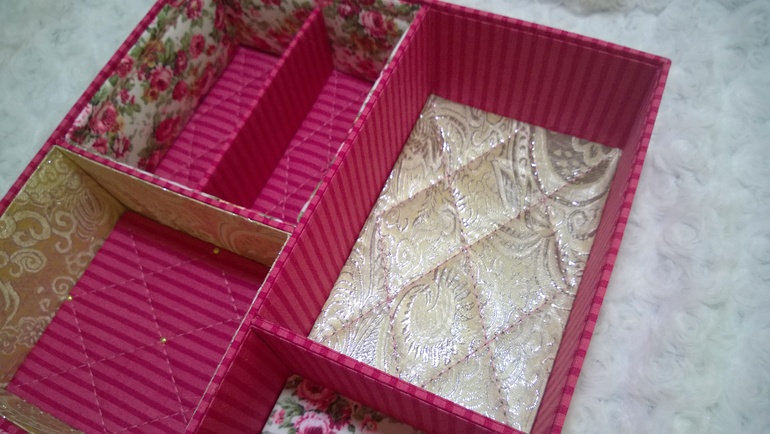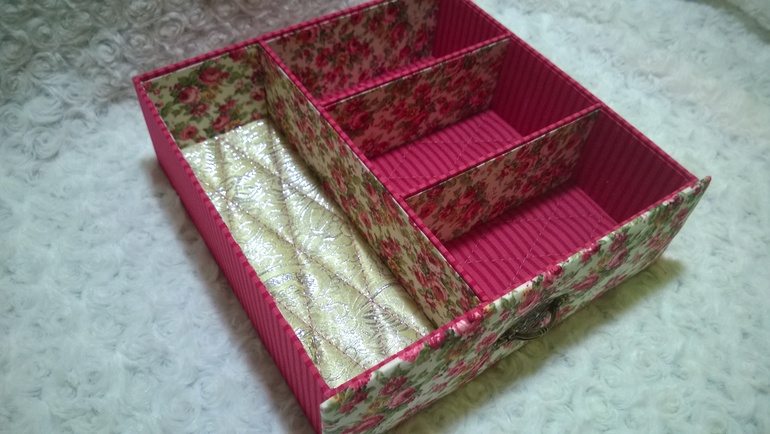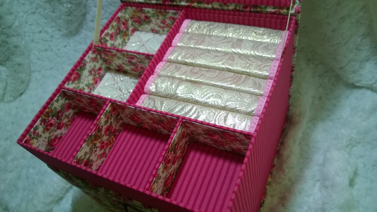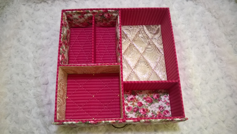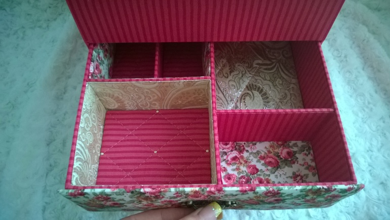 сама все хочу сделать шкатулочку, но останавливает то, что психану, пока буду "внутренности" обклеивать)))Вероника, а расскажите,пожалуйста, ход действий:сначала обтянули тканью внешние стороны шкатулки, а потом аккуратно просовывали ткань во внутреннии отсеки? и для внутрянки ткань клеили на бумагу?спасибо!