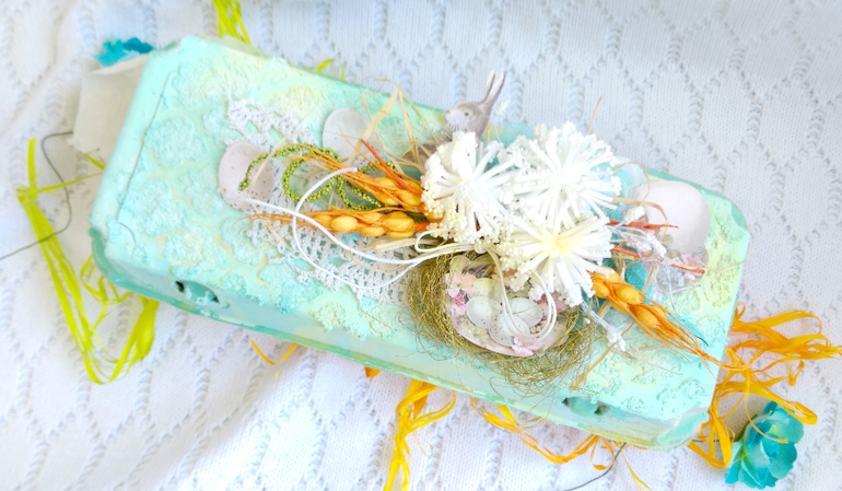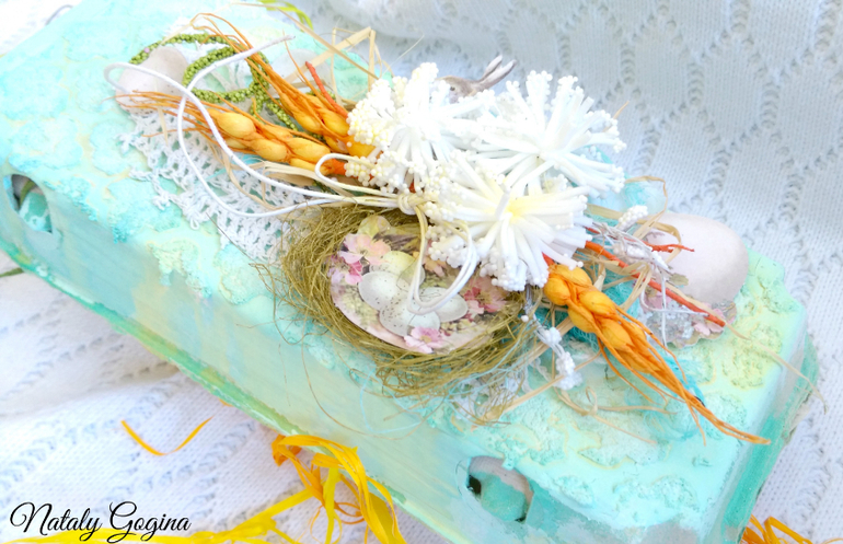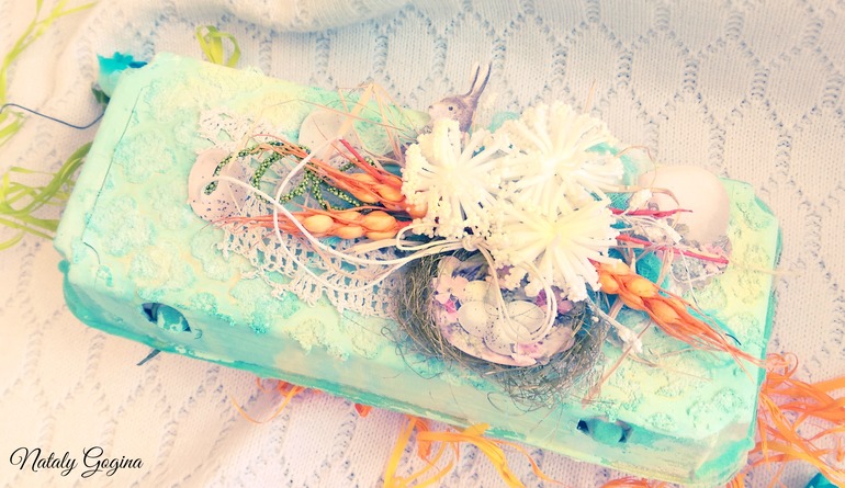 Долго меня не «трогал» Пасхальный декор, а вчера вечером прям загорелась))). Так мне захотелось сделать красивую коробочку для крашаночек и покрасить яички в технике декупаж, только с помощью крахмала, вместо клея. Не знаю дойду ли завтра до задумки с яичками, но коробочку мы с сынулей сделали, да он помогал мне брызгать спреями и наносить текстурную пасту и грунт, а еще ответсвенно подавал клей)))))))