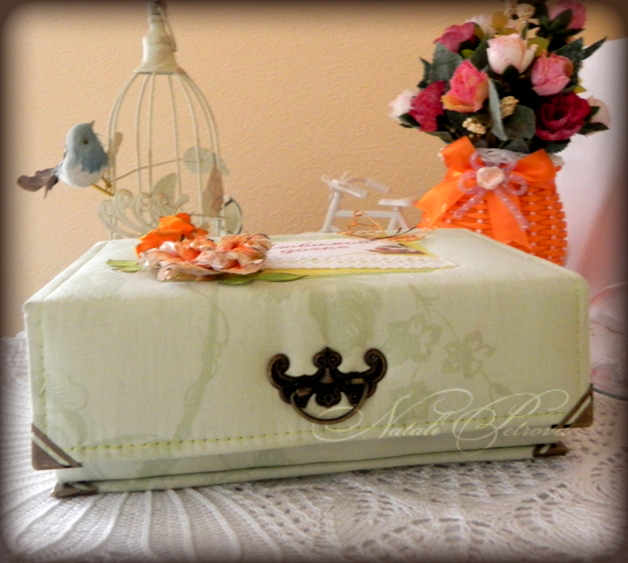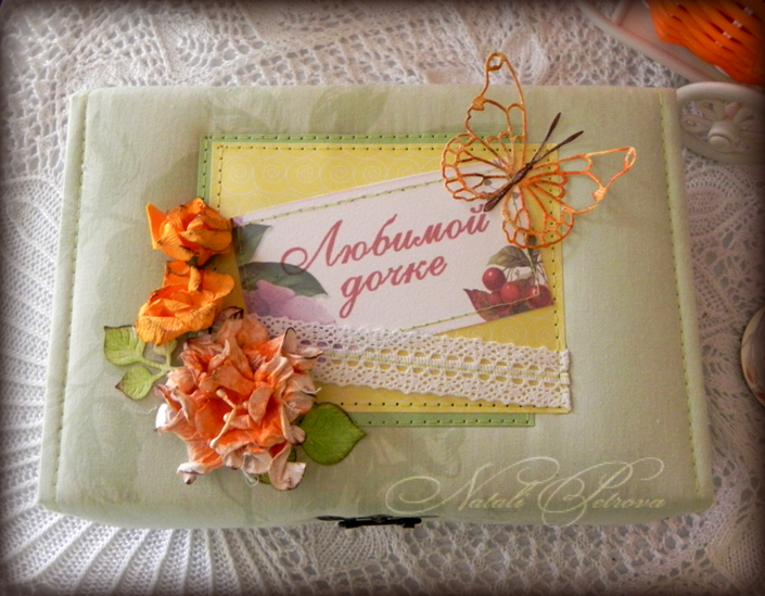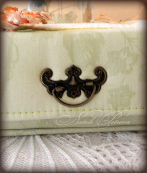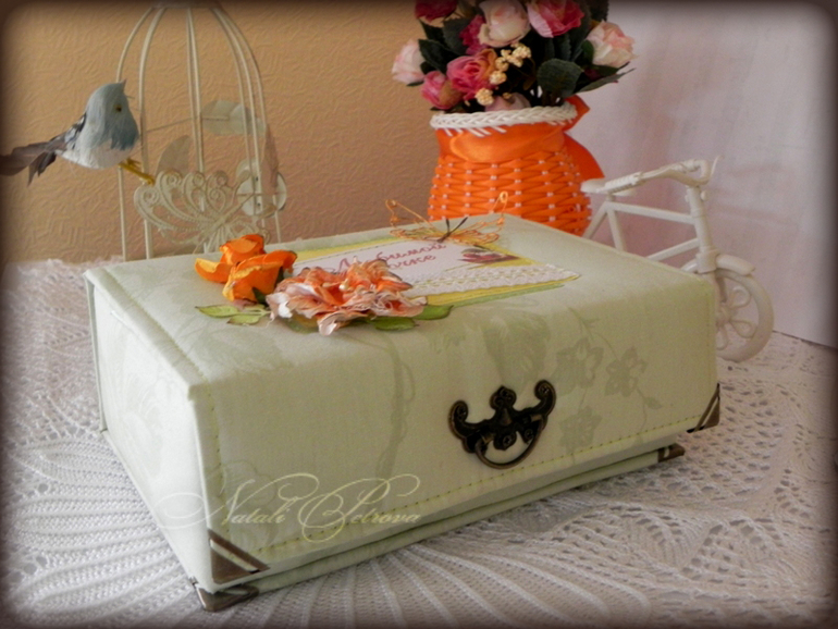 Наташа, ткань хорошо натянула) Единственное, я вот своих покупателей переубеждаю по поводу надписи типа как у тебя. Это ведь не открытка) У тебя фурнитура красивая, вот внутри на крышке рамочка — сверху она бы круче смотрелась, а здесь и могла бы надпись "любимой дочке" сделать)
