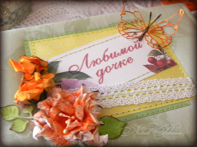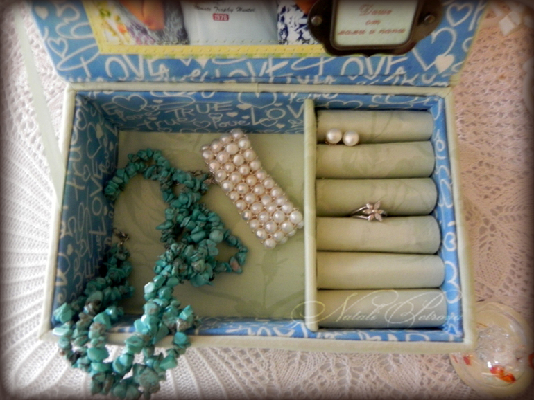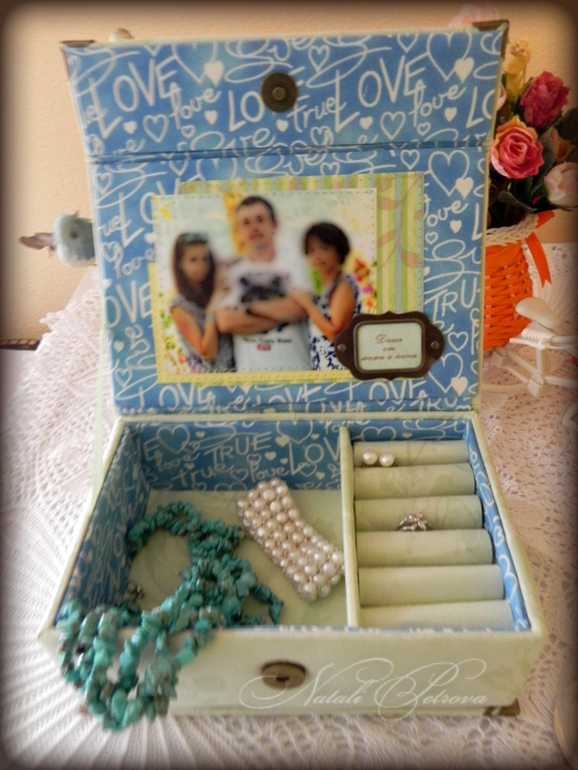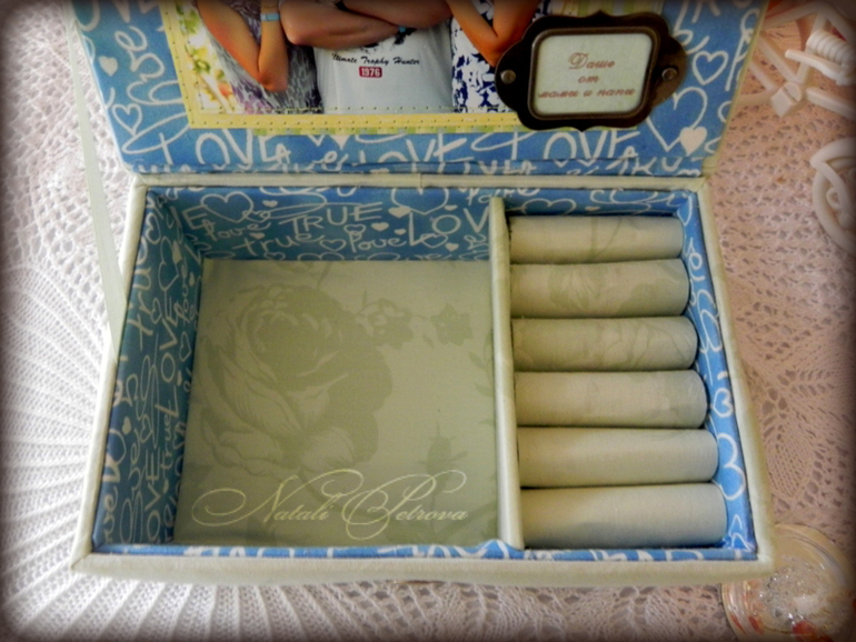 Она сначала хотела, потом расхотела делать, не успевала приготовить причины. Вот и я ничего не делала, а накануне дня рождения звонит и спрашивает про шкатулку. Я естественно не успела, поэтому она стала шкатулкой для украшений. Подарок вдогонку к празднику. А по поводу надписи. Любимой дочке Даше от мамы и папы. Начало фразы на шкатулке, продолжение — внутри