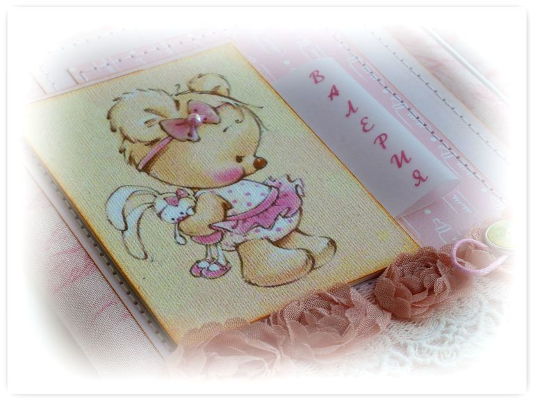 Имя малышки напечатано на вэллуме, бантик покрыт глосси (хоть на фото этого и не видно, ну не умею я фотографтровать ;)) и украшен жемчуженкой . Корейское кружево - какое же оно классное)))