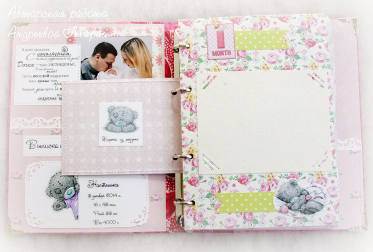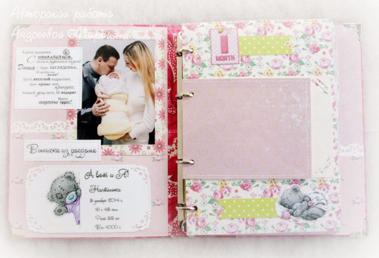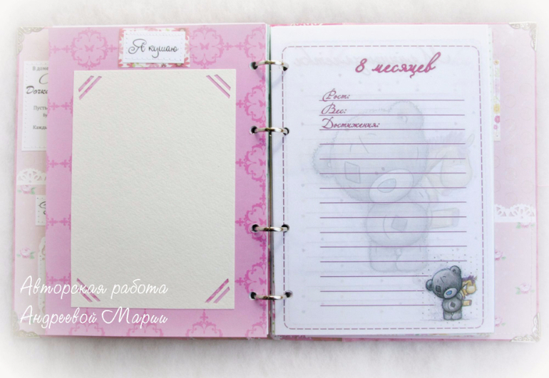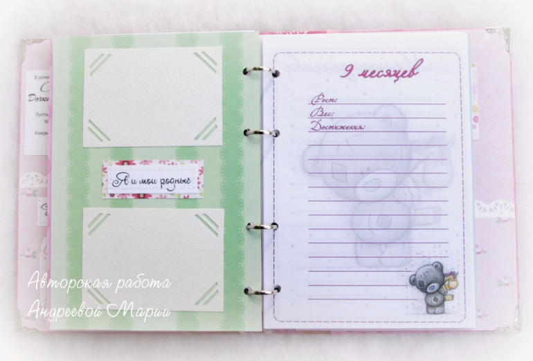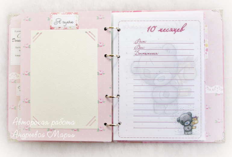 Внутри 12 разделителей на каждый месяц жизни ребенка, на первом форзаце метрика и фото с выписки, на последнем - кармашек для чего-нибудь, например, документов. Блокнот вмещает 16 фото 10*15 и 8 фото 6*9, кармашек для бирочки.