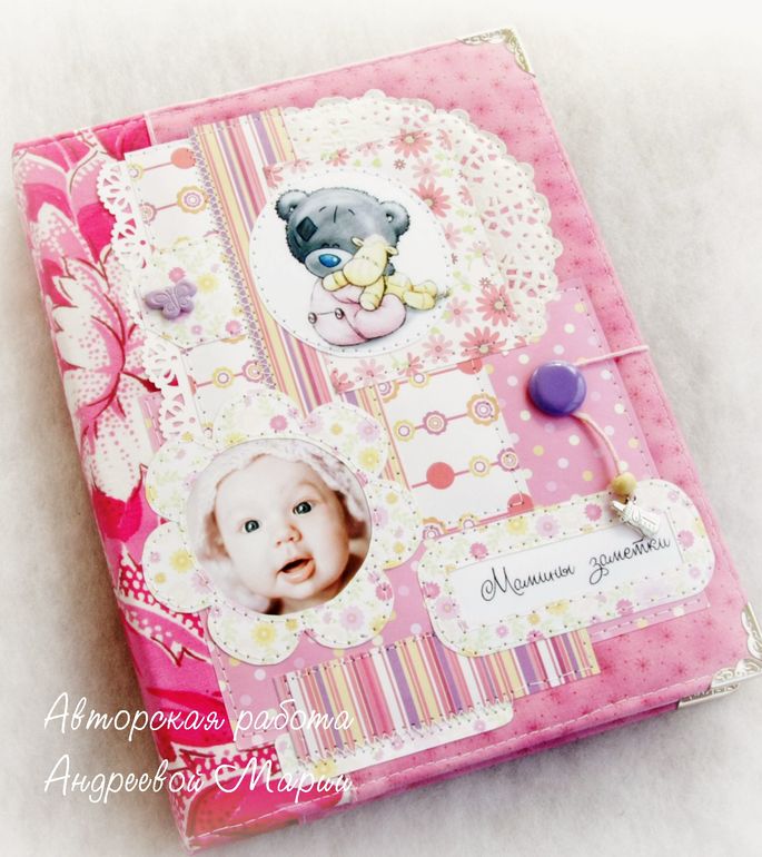 БлокнотыБлокнот "Мамины заметки" еще никому не делала, с дебютом меня))) Получился по-моему альбомо-блокнот. Формат А5. На кольцах, мне показалось, что так будет практичнее, можно что-то убрать, что-то добавить. Обложка - хлопок, застегивается на шнурочек и брадс.