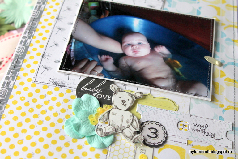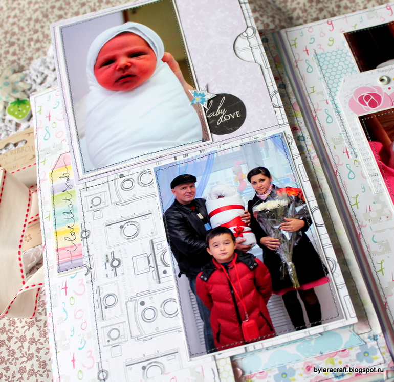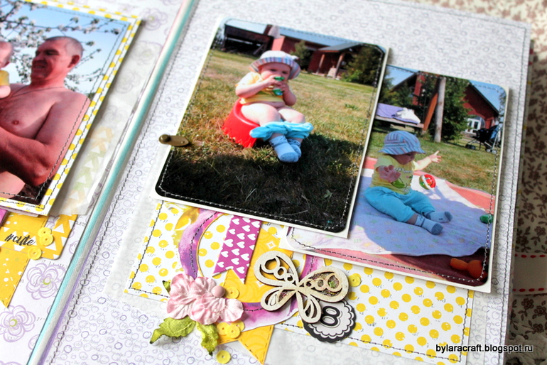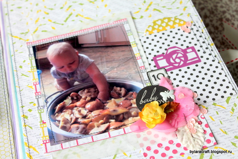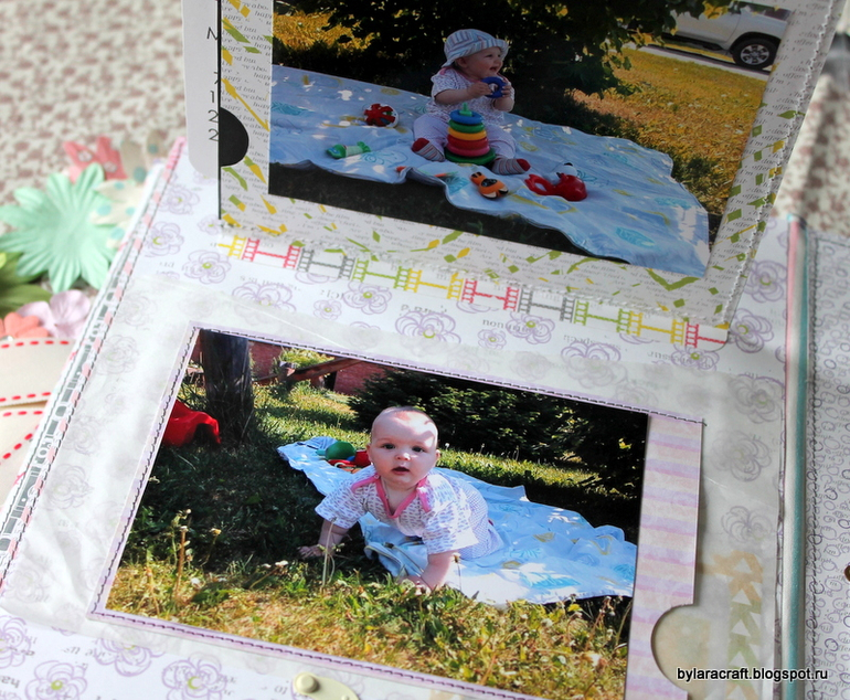 Здесьпод фото раскладушка и потайная страница с дня рождения Софии. Фотографии с дня рождения никак не вписывались в общую картинку, и я решила их спрятать.