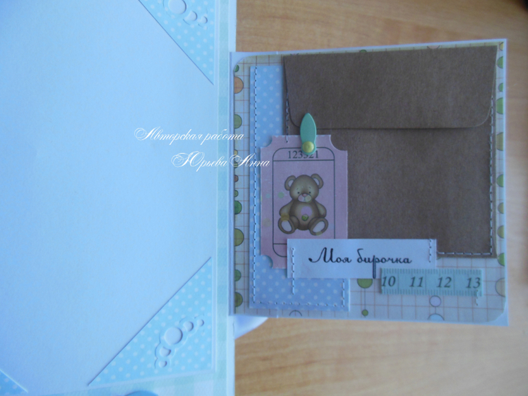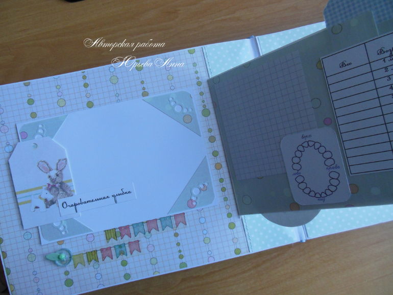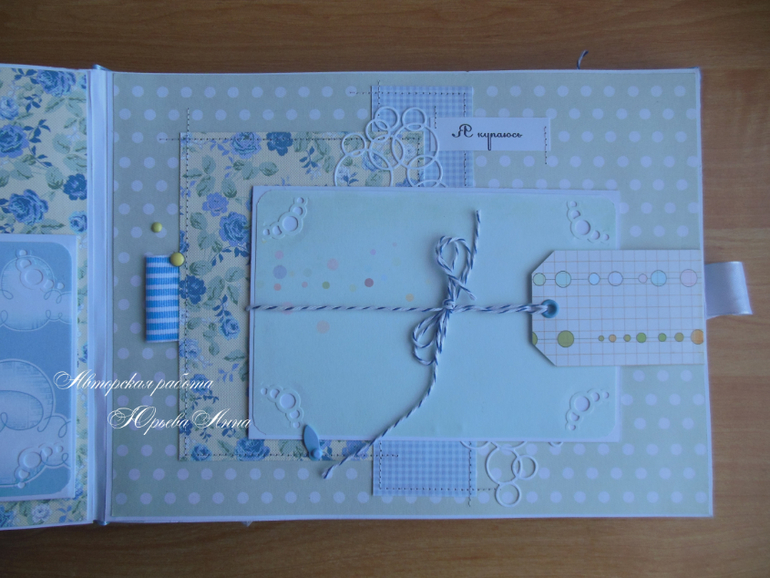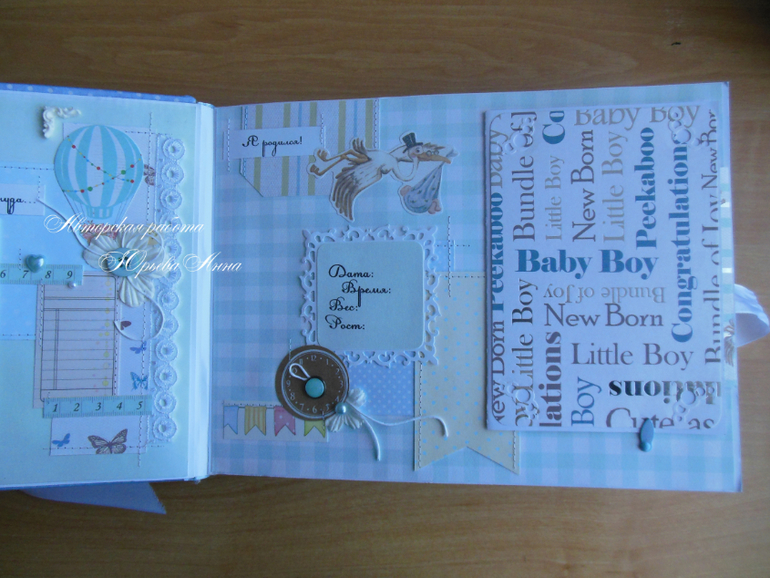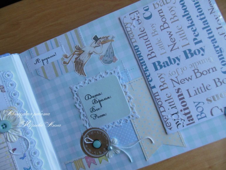 Размер альбом 20х26см, 18 тематических страниц и 58 фотографий 10х15 на подложках. Также в альбоме есть прозрачный кармашек для фото УЗИ, карточки для записей о росте, весе, достижениях и появлении зубов малыша, крафт-конверт для бирочки из роддома и тэги для записей. Обложка проложена синтепоном и обтянута хлопком. Получился очень нежный, мягкий и теплый альбом.
