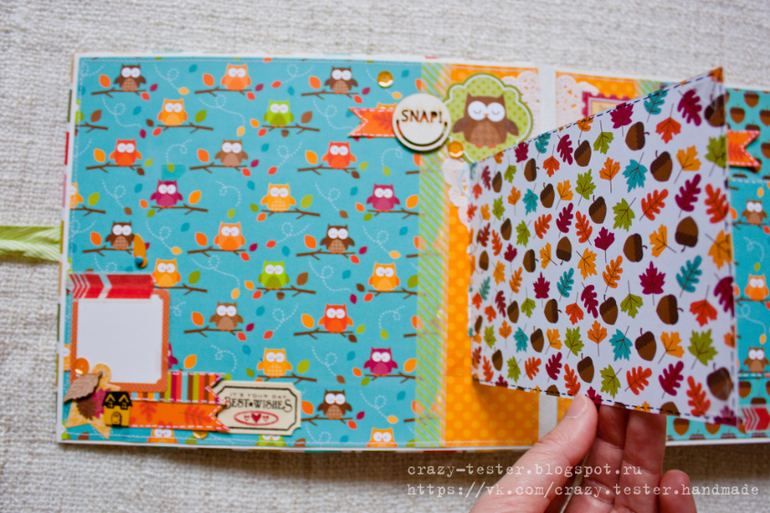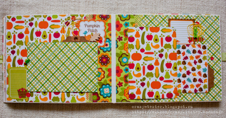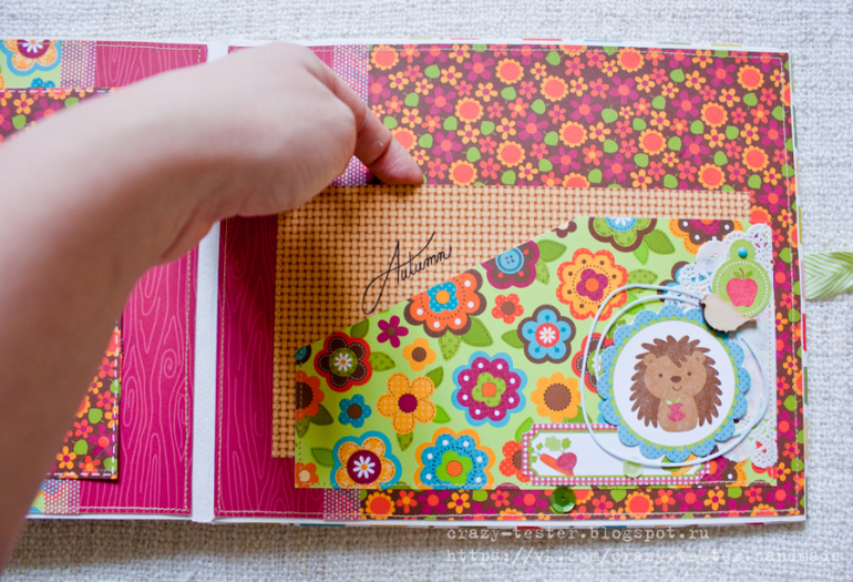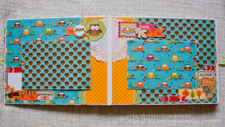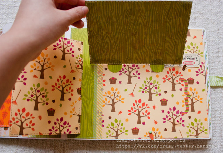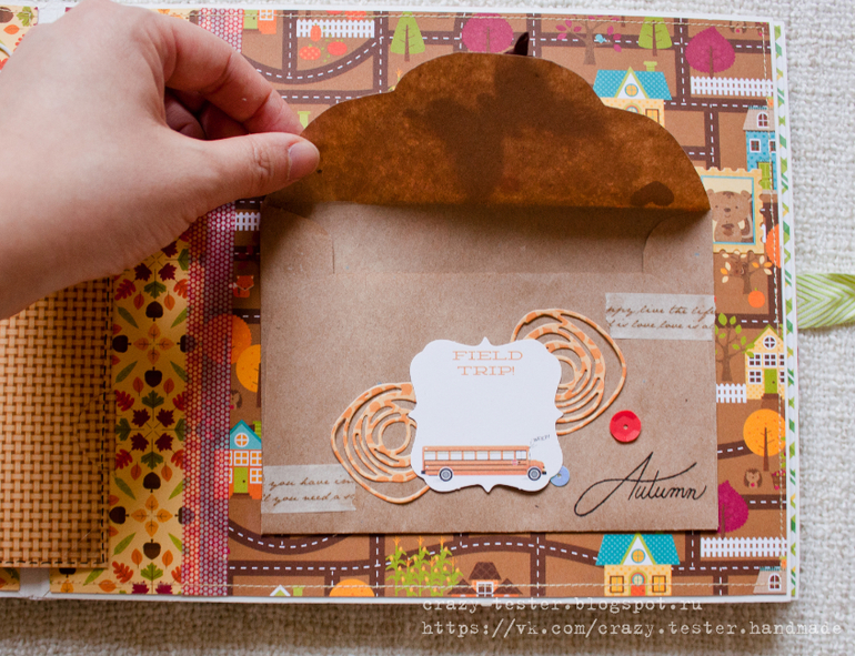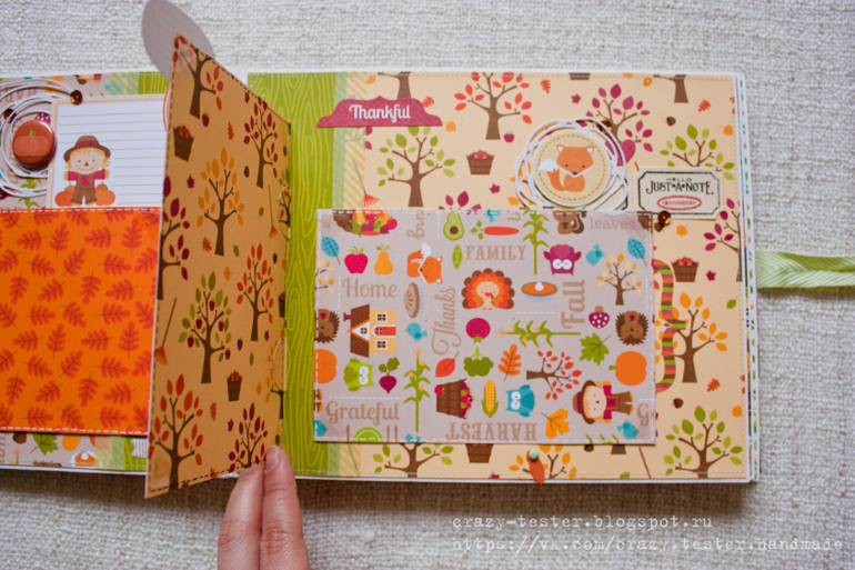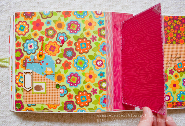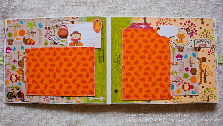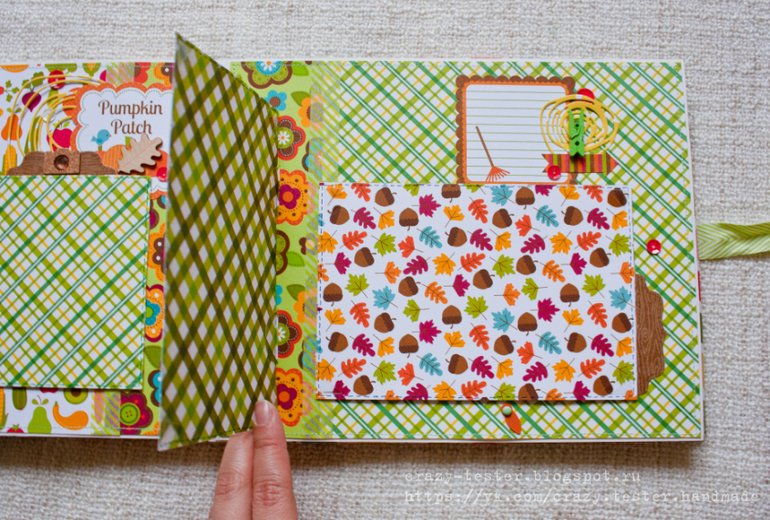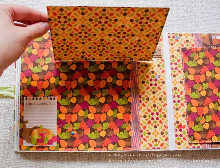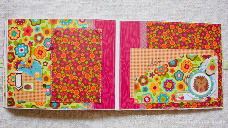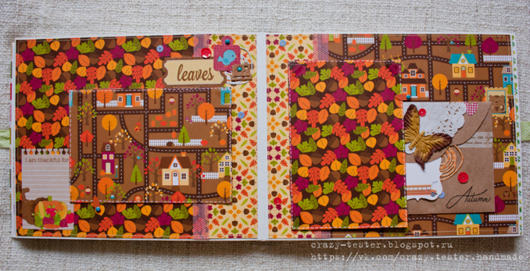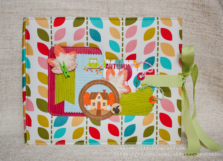 Покажу осенний фотоальбом. Альбом размера 24,5*20 в твердом переплете и мягкой хлопковой обложке. Пять разворотов (10 страниц) на 30 фотографий размера 10*15, есть место для записей, один крафт-конверт и два кармана для дополнительных фотографий.