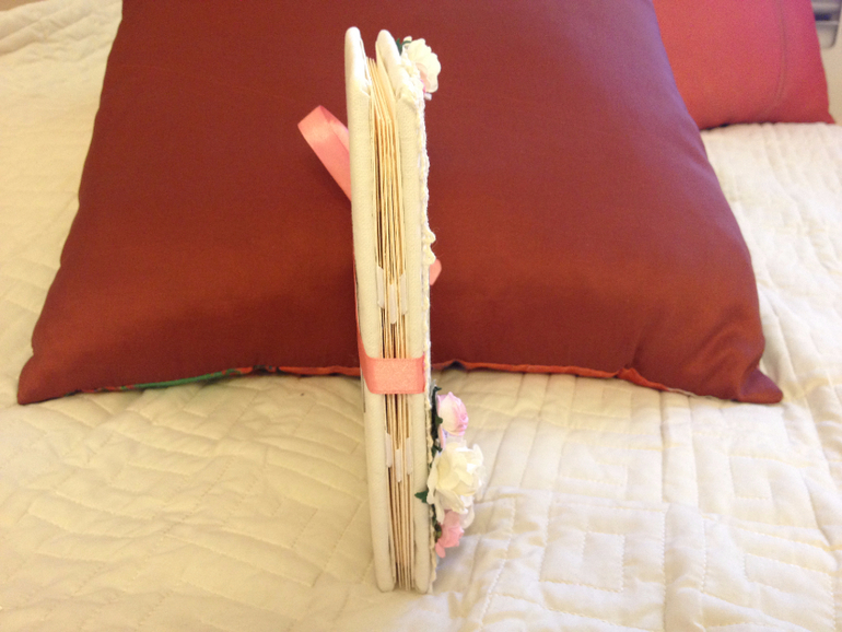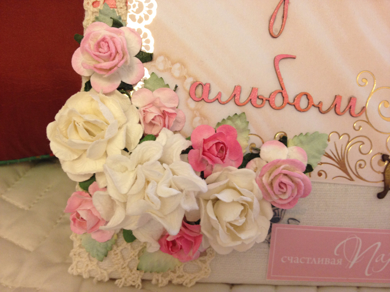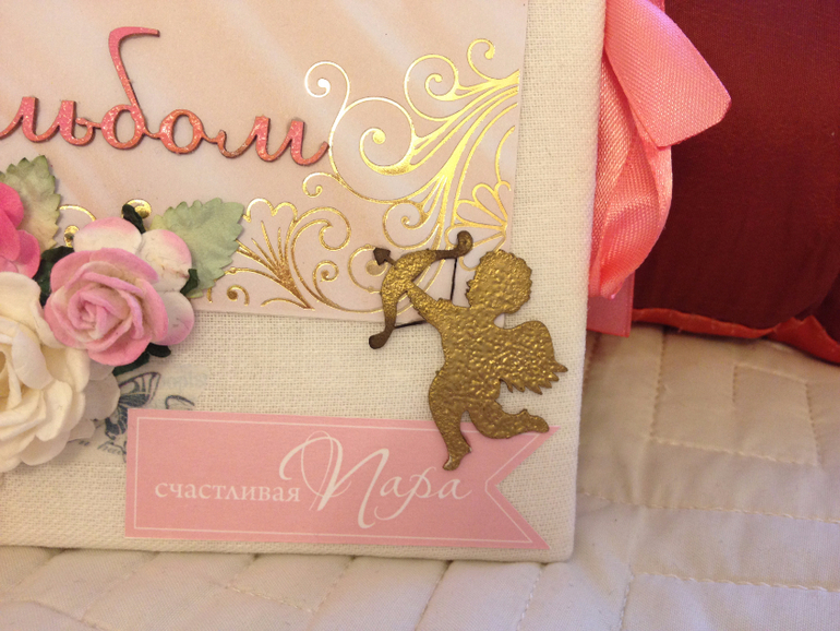 1. Мини-альбом для фото 10*15 в мягкой обложке на 10 фото. ( вот мк, по которому я его сделала). Ткань лен, кружево, стразы, цветы, ну и конечно не смогла обойтись без пудры для эмбоссинга, которая нанесена на ангела и на надпись).