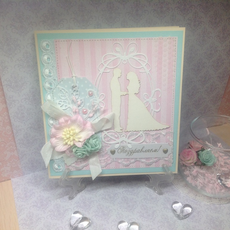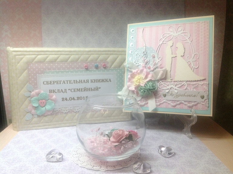 В комплект со сберкнижкой делала еще открыточку в мятно- розовых тонах, нравится мне такое сочетание:) вот что у меня получилось