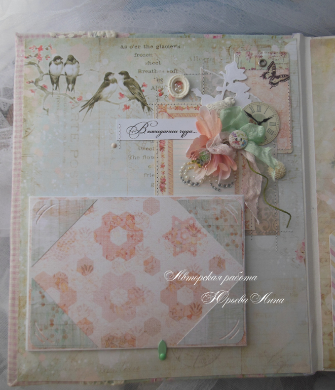 Очень хорошенький альбом. Вот только развороты показались гораздо интересней , чем обложка и хочется прямоугольник убрать, и цветов побольше добавить. Только не обижайтесь, пожалуйста. Мне вот до такого расти и расти.