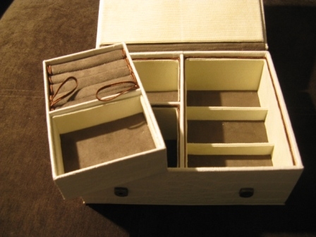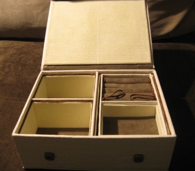 Что-то я много говорю. Пора уже и к делу переходить. Размер 23Х18Х7 см. Один из блоков съемный. Обтянуто белым, ближе к молочному, кожзамом с фактурой крокодиловой кожи. Донышки и разделители для колец из искусственной замши, а внутренние стенки и крышка внутри вельвет сливочного цвета.