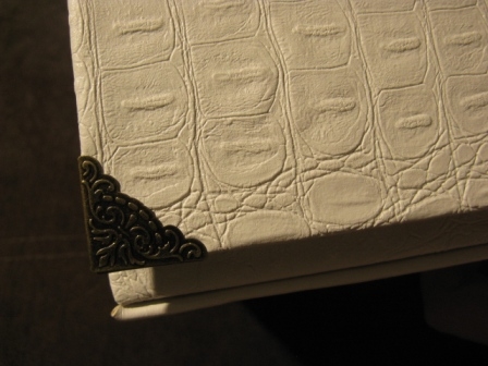 Закрывается на 2 магнитных брадса, углы прикрыты уголками. Снизу есть ножки, чтобы не обтиралось донышко