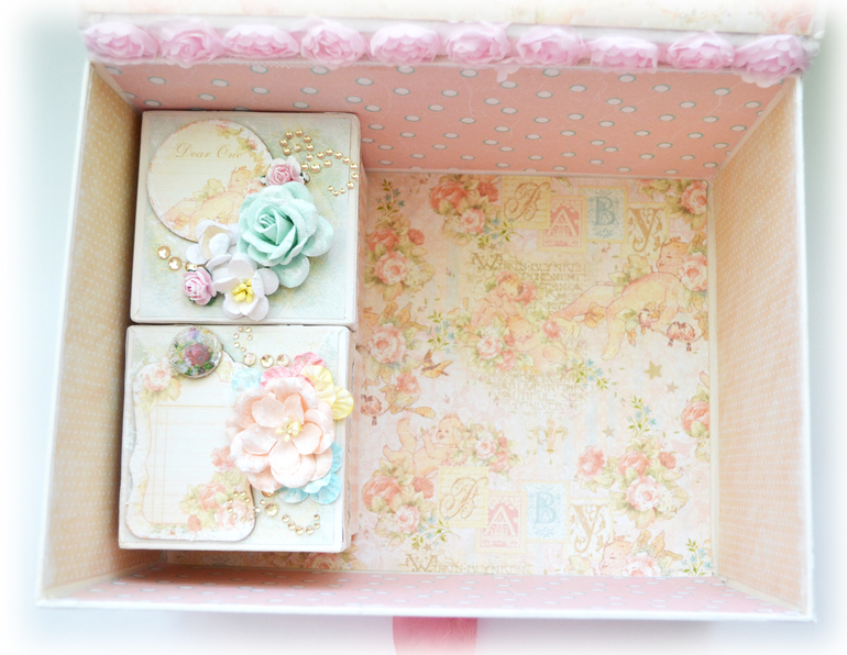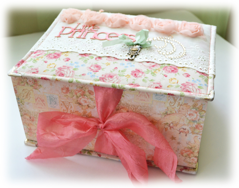 . И заказала мне наша воспитательница "такую же" коробочку для своей внучки, которой скоро исполнится годик. Естественно, я решила сделать ей тканевую коробку и сделала еще 2 маленькие внутри. А что именно там разместит мама девочки, мы не знаем, поэтому ничего не подписывала. Кстати, коробочки получились довольно вместительные, так что в них можно положить сразу несколько "ценных" вещей малышки. Итак, большая коробка размером 26X20X14 см. Использована бумага из коллекции Графики.