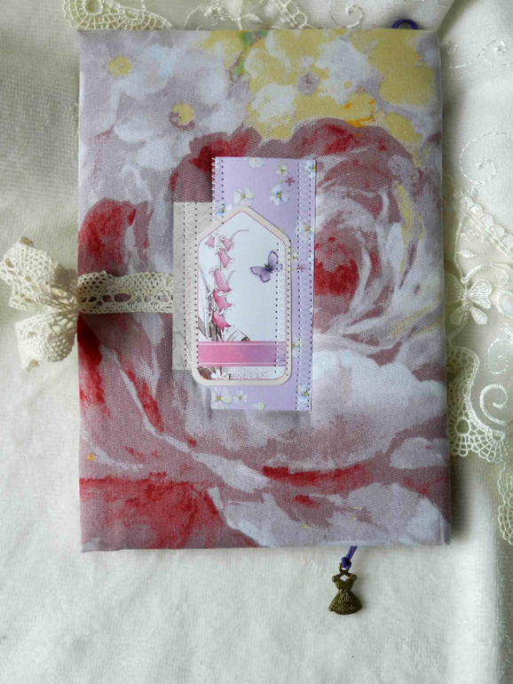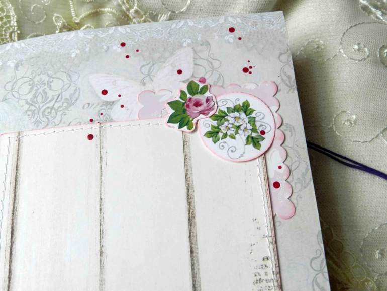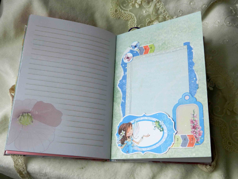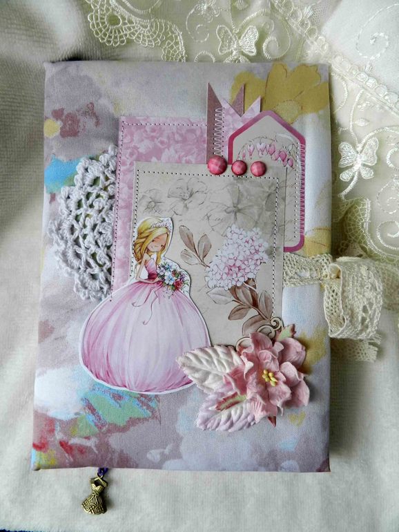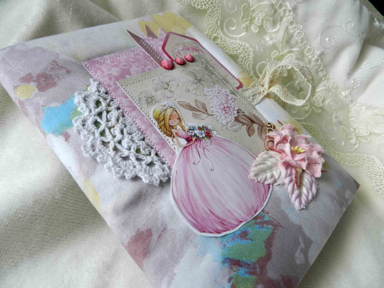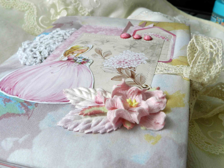 Беби-бук формата А5. Тканевая обложка, завязывается на кружевные ленточки. Из ОЭ в обложке Анастасии я использовала:флажки, кружевной элемент и цветы.
