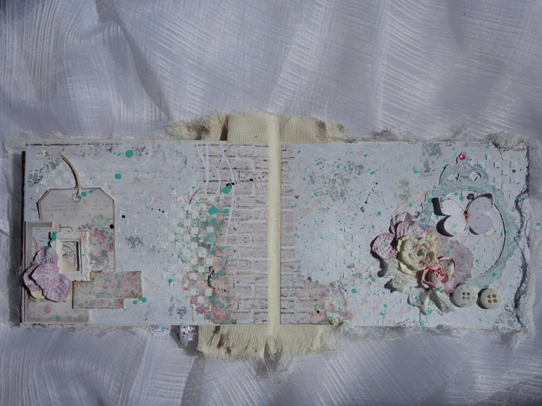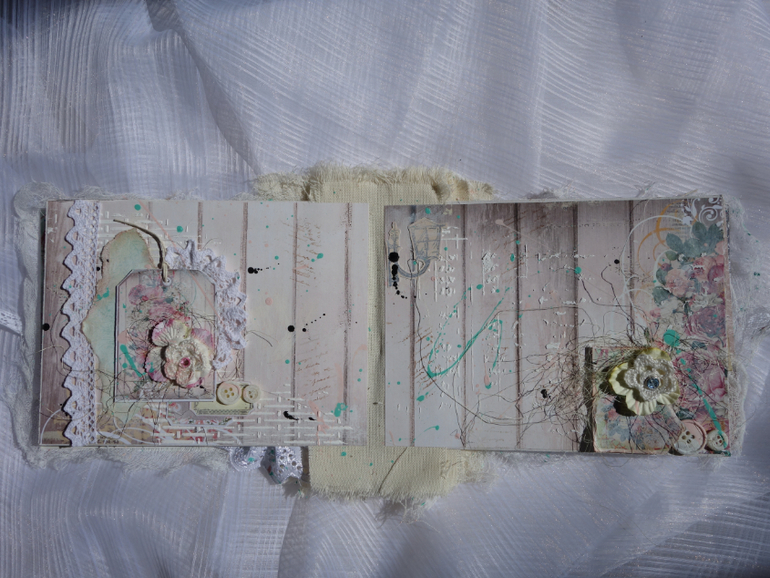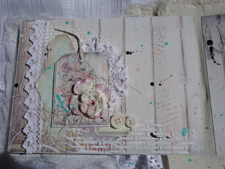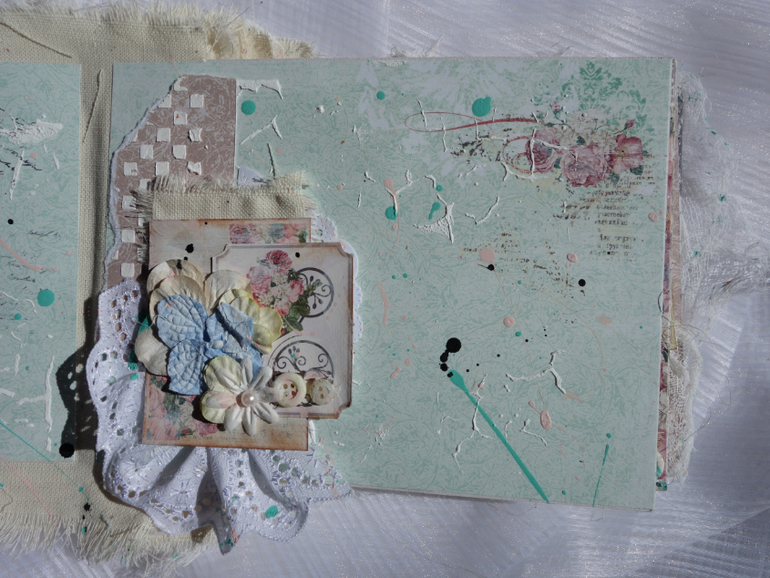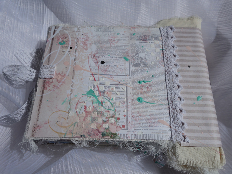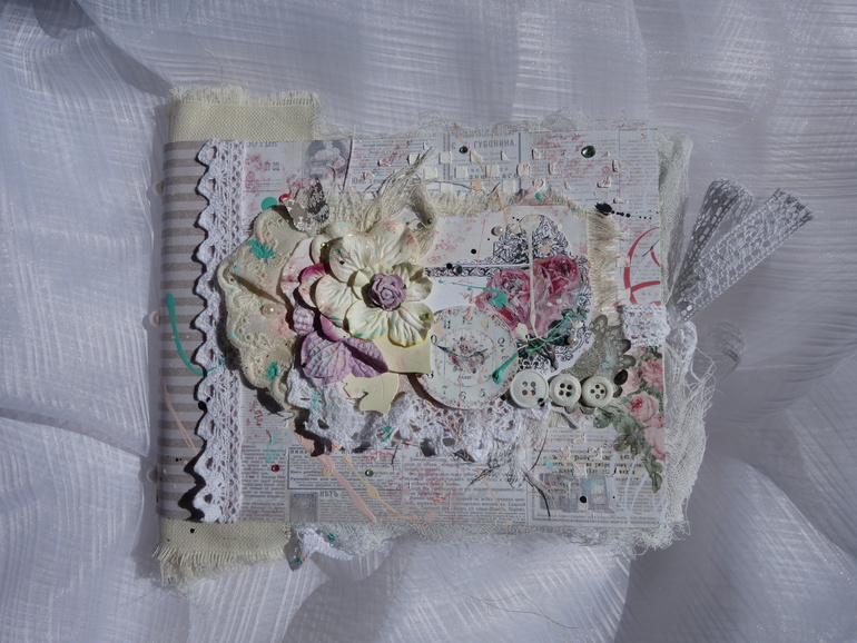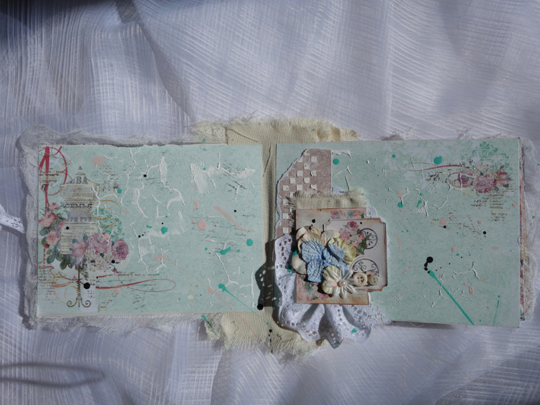 Альбомы для женщин (девушек)Всем привет. Недавно я была на МК Веды Бакаловой " Лохматый альбом " . мне очень понравилось .Такого я еще не делала. Альбом 15х20 , 4 разворота . В работе использовалось кружево .шитье ,вырубка ,цветочки и т.д. Использовалась паста и краски.Понравилось делать брызги.Альбом рассчитан на фотографии небольшого размера.