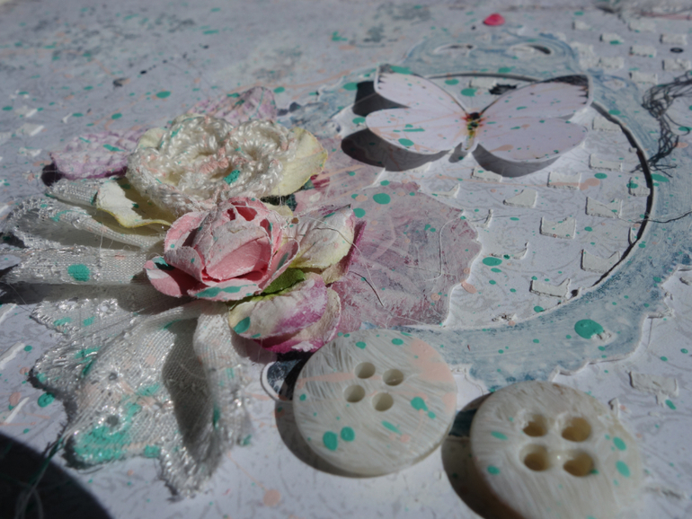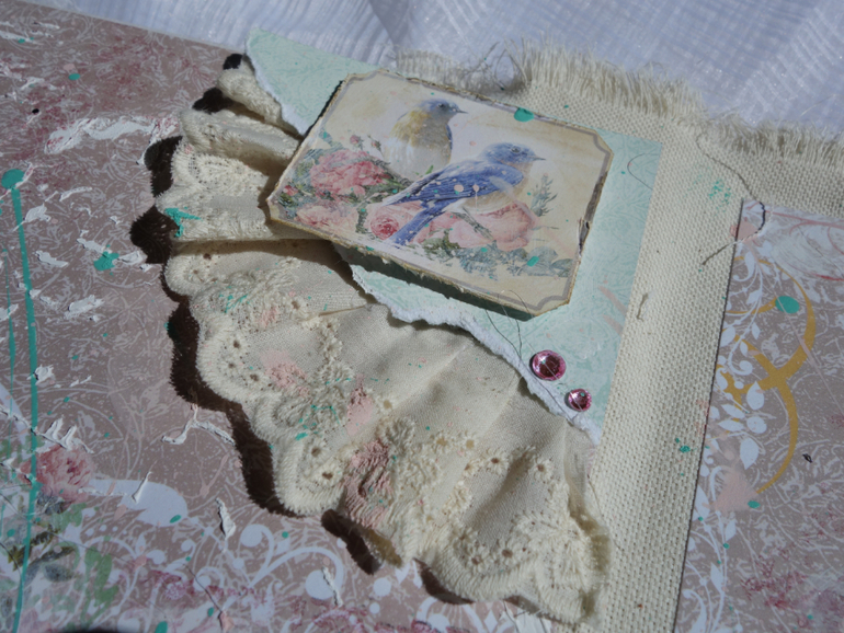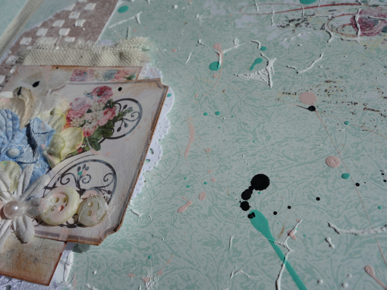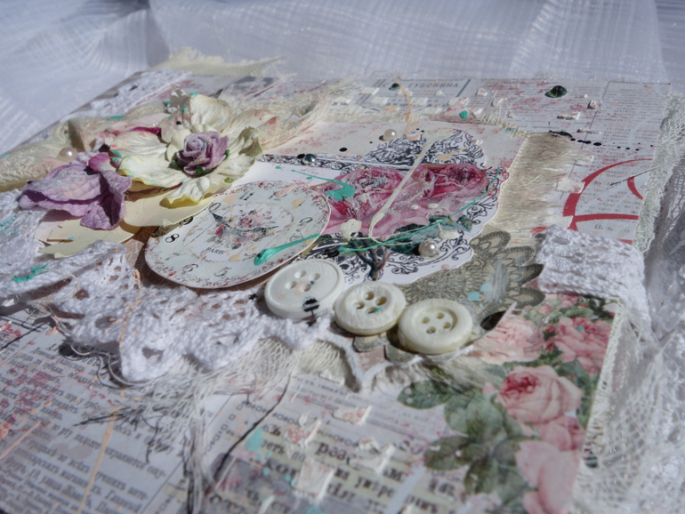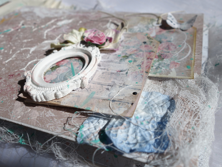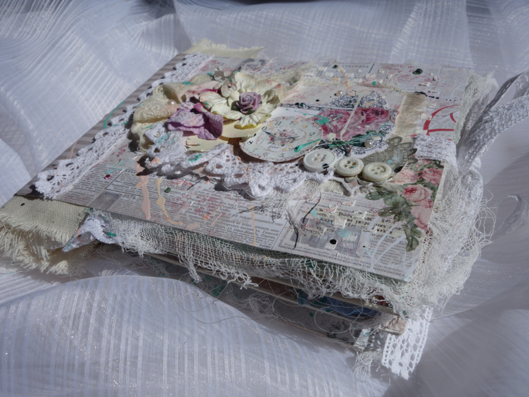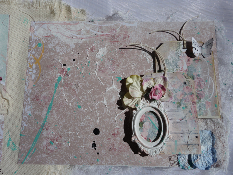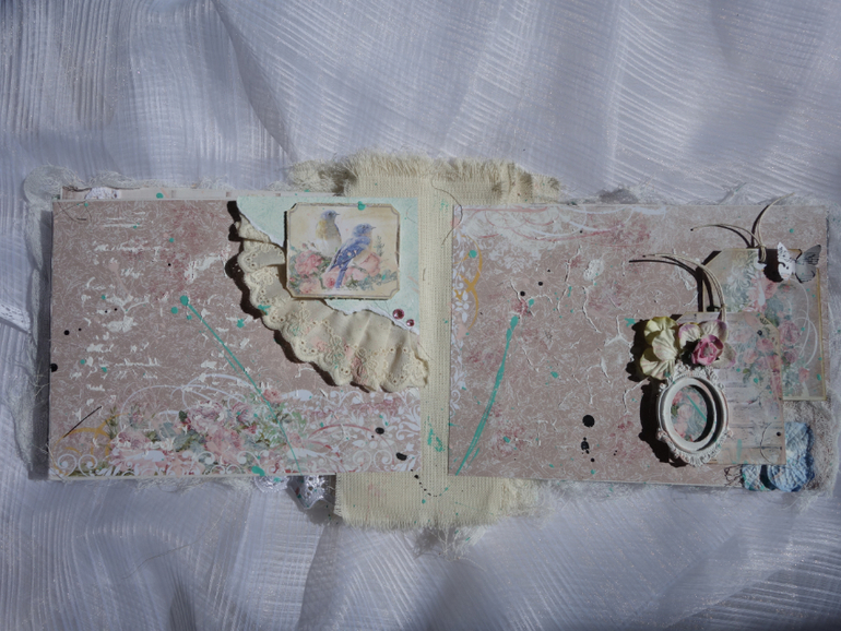 Альбомы для женщин (девушек)Всем привет. Недавно я была на МК Веды Бакаловой " Лохматый альбом " . мне очень понравилось .Такого я еще не делала. Альбом 15х20 , 4 разворота . В работе использовалось кружево .шитье ,вырубка ,цветочки и т.д. Использовалась паста и краски.Понравилось делать брызги.Альбом рассчитан на фотографии небольшого размера.