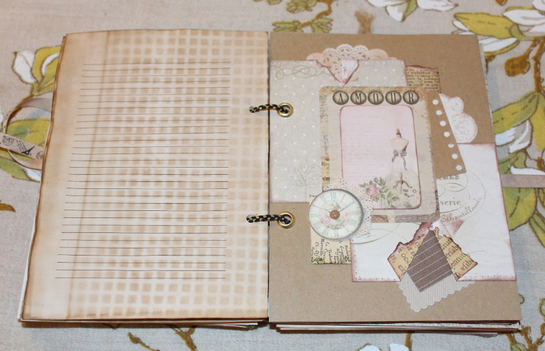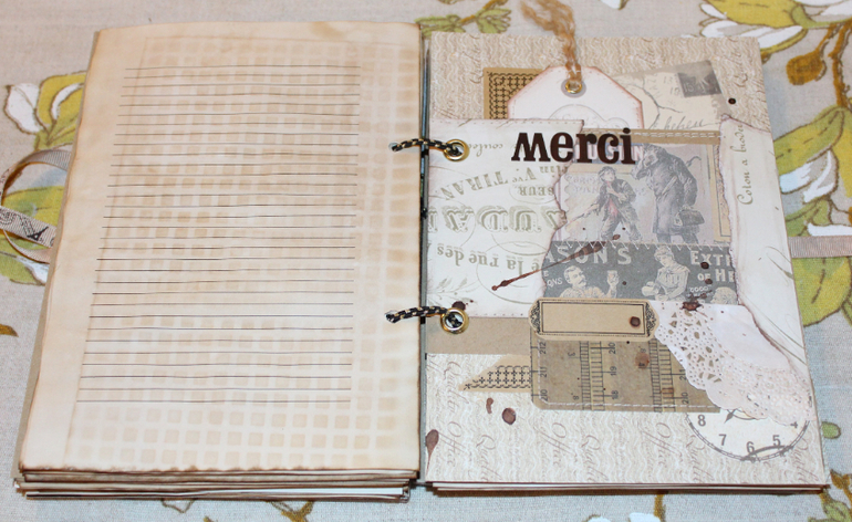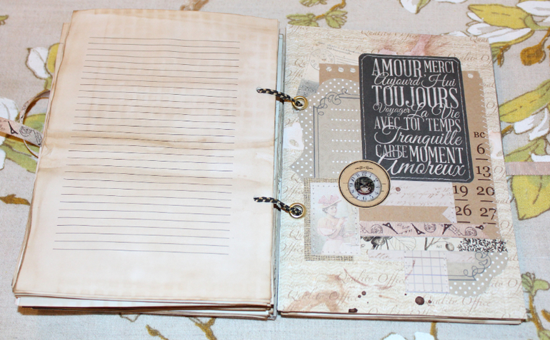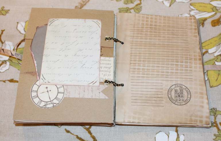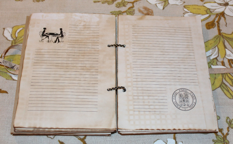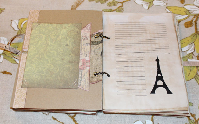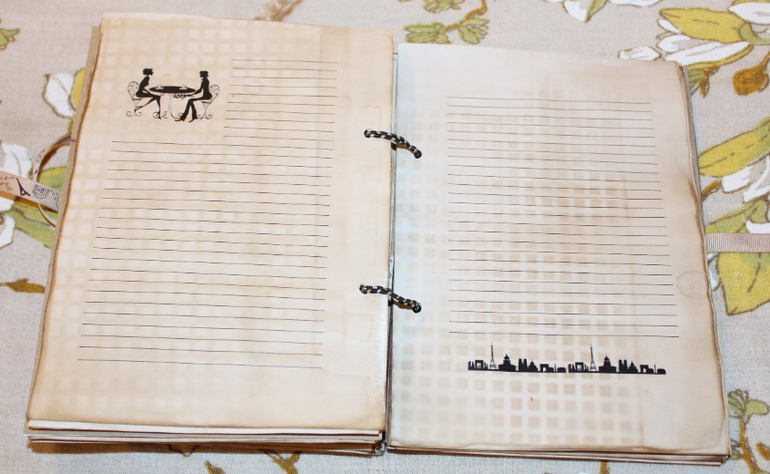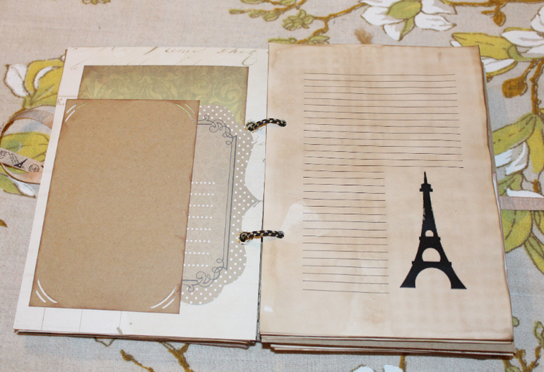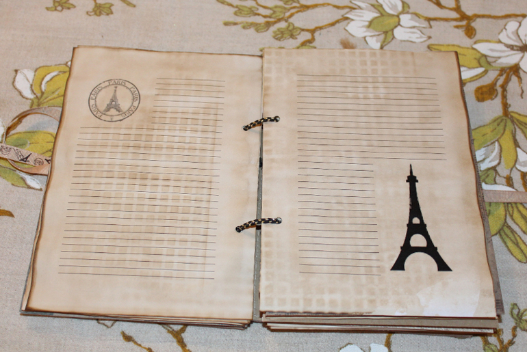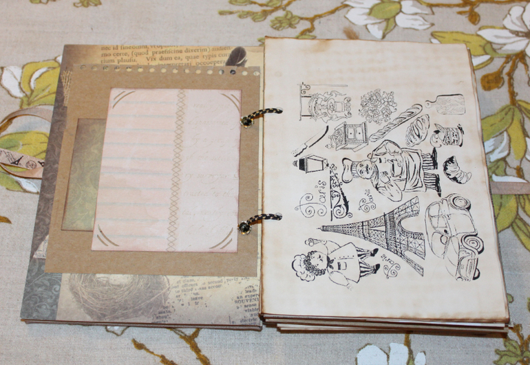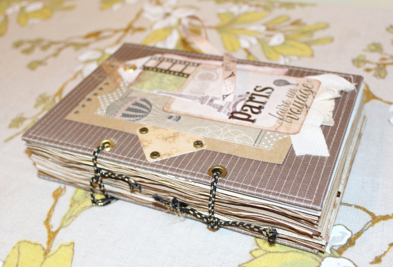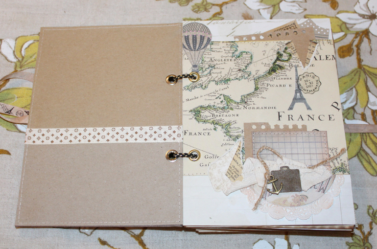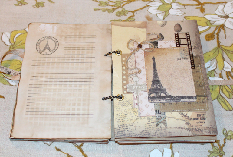 Мой бук Парижский, может быть тревел буком для записи отчета о путешествии и прочих нужностей и полезностей, а может быть просто настроенчиским блокнотом. Странички окрашены растворим цикорием, клеточки на страничках - неожиданный эффект от сушки на решетке батареи. На оборотной стороне каждого разделителя место для фото. Фозацы крафт, на каждом форзаце карман для мелочей. Обложка из плотной ткани. Формат А5