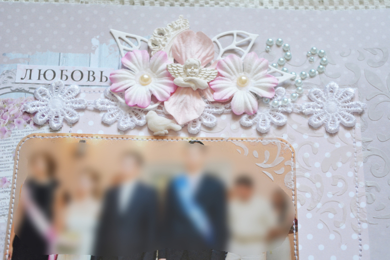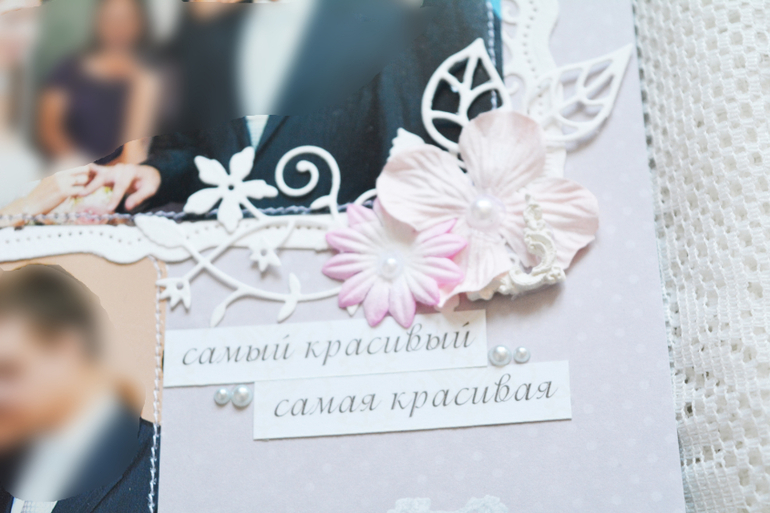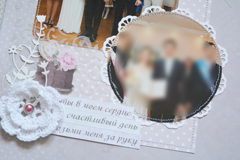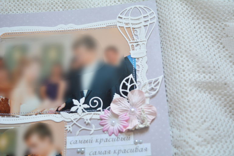 В своем развороте я использовала все пункты, помимо измененного под мою страничку скетча я взяла надписи, вырезанные из бумажки флер дизайн свадебной коллекции, завитки сделала полужемчугом и текстурной пастой, цветы у меня бумажные и один вязаный, что-то сладкое, это тортик из бумажки Тильда, также что-то воздушное это воздушный шар, может он и не совсем здесь в тему, но мне он так понравился, что я не устояла и приклеила его, как символ воздушности чувств, в которых мы парили в тот день) как то так)))