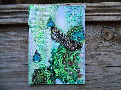 Использовала лен и еще какую-то ткань, не знаю как называется, грунт, текстурную пасту, краски, тушь, жидкий жемчуг и глиттер, эмбоссинг