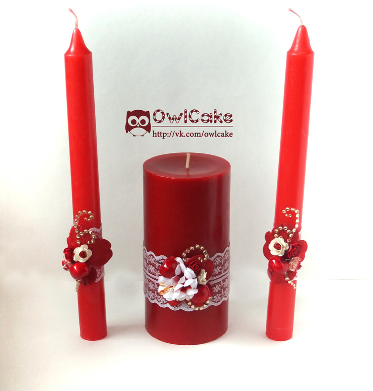 По традиции 2 тонкие свечи для родителей жениха и невесты, которые зажгут новый семейный очаг своих детей, большую и крепкую свечу, которая потрясающе пахнет лесными ягодами)