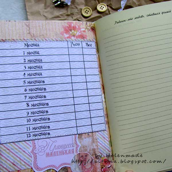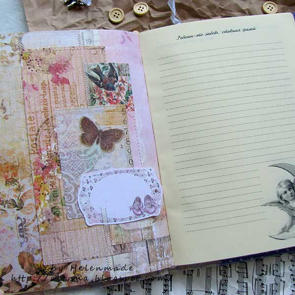 БлокнотыПривет, девочки! Поздравляю вас с прошедшими праздниками. Пусть мир и добро будет в наших домах и странах!!!. Я прибежала показать вам мамин блокнот, очень нежный, для мамы маленькой девочки.Формат А5, 100 тонированных листика с винтажными ангелочками и цитатами известных людей про деток.На форзацах есть кармашки для памятных мелочей, бирочки,записок и т.д. Два разделителя, где можно разместить фото юной принцессы, есть табличка с данными роста и веса в первый год жизни малышки. Завязывается на шелковые ленты, есть закладка. Обложка выполнена из качественного немецкого хлопка, все детали декора дополнительно пришиты для прочности.