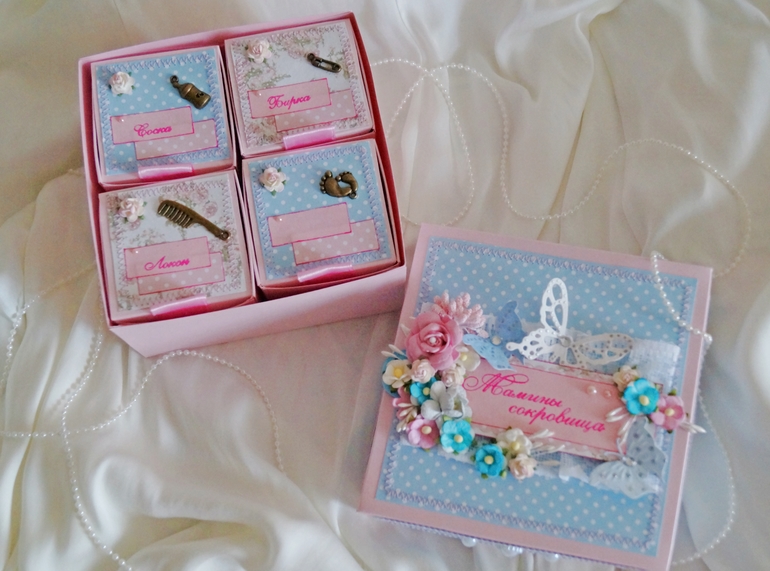 Мамины сокровища на 4 коробочки - это соска, бирка, локон и одну коробочку можете подписать сами на свое усмотрение.