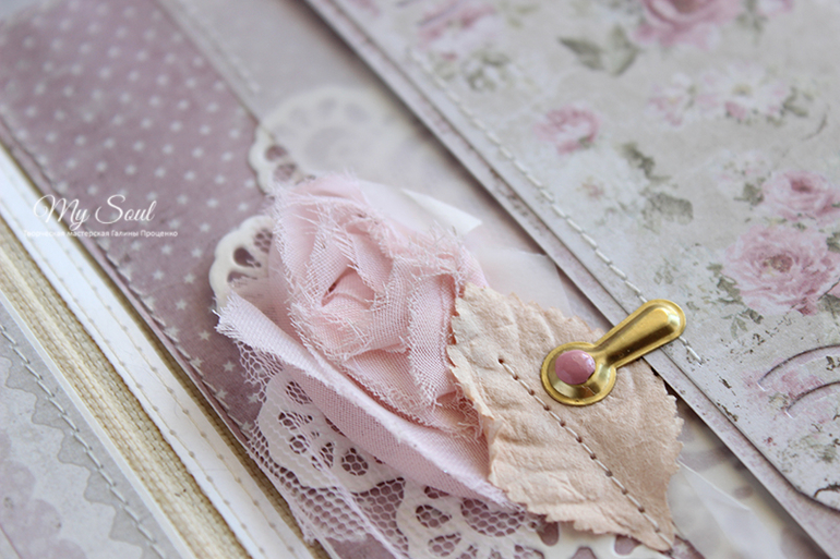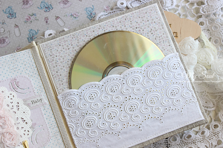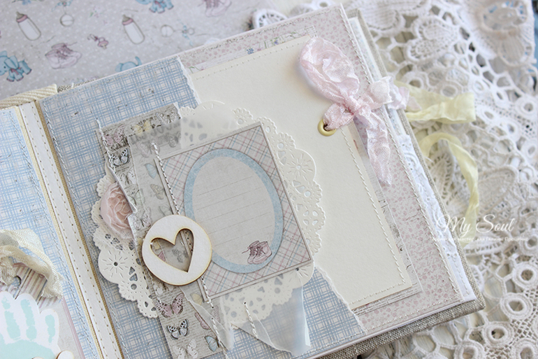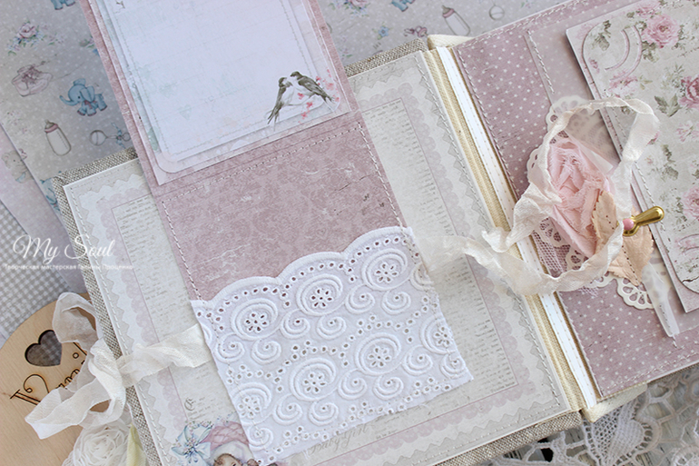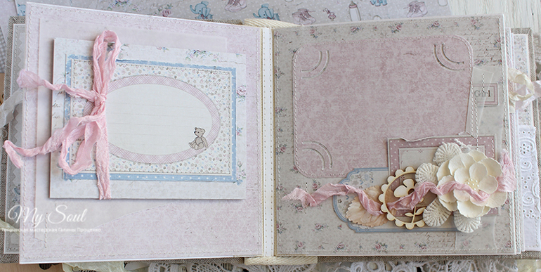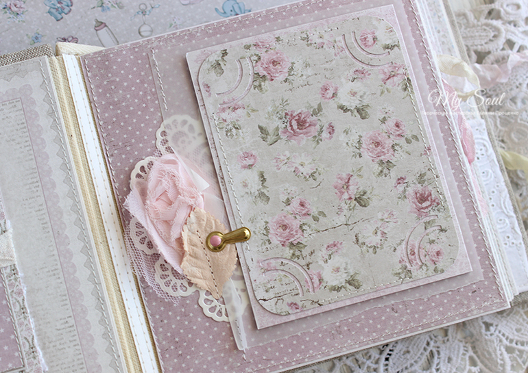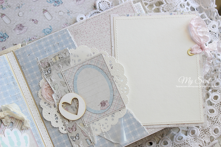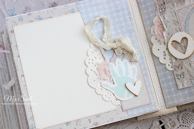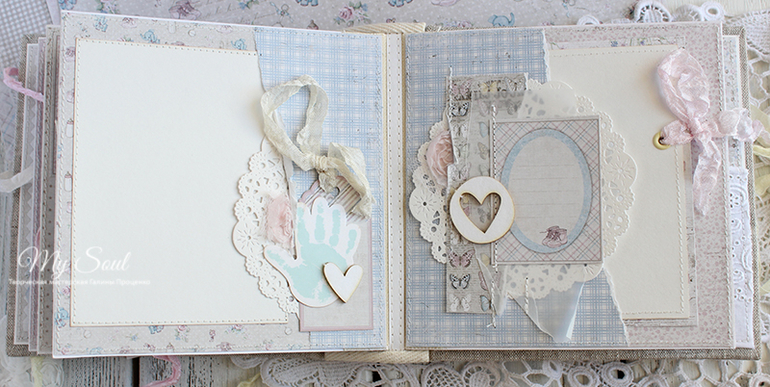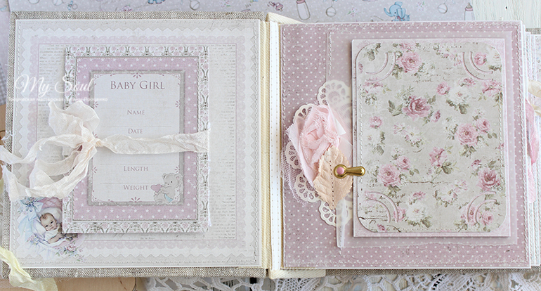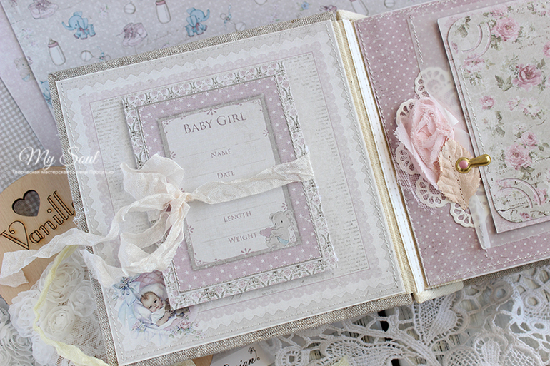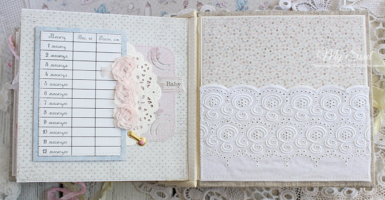 Первый разворот - слева метрика, карточка для записи и кружевной кармашек для бирочки из роддома, теста и фото УЗИ, а справа книжечка для первых фото малышки)