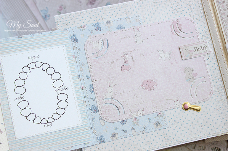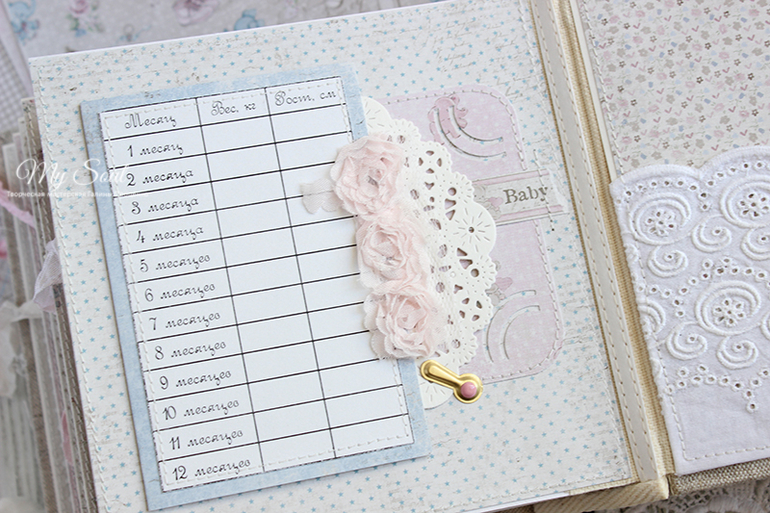 И последний, пятый разворот - с табличками Рост/Вес, графиком роста зубиков и кружевным карманом для диска с фото или просто для дополнительных фотографий)
