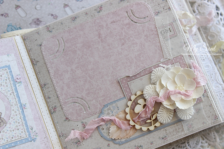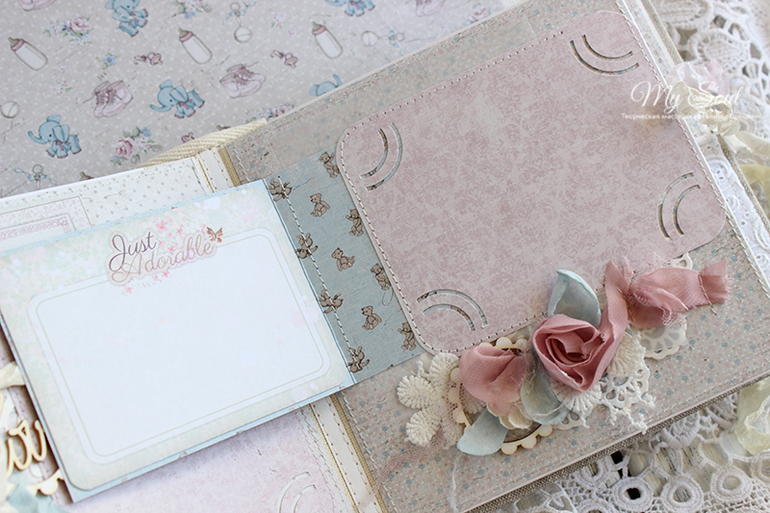 В альбоме небольшое количество украшений, поскольку бумага настолько хороша, что сама по себе уже является самым главным украшением))) Мне хотелось в этот раз сделать такое маленькое хранилище самых главных и дорогих воспоминаний про первый годик жизни малышки)