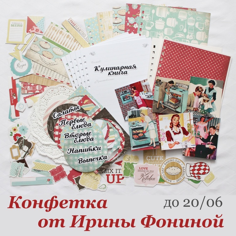 Приглашаю вас на свою летнюю конфетку. Через месяц я разыграю среди записавшихся на нее уникальный скрап-набор для создания кулинарной книги. Условия очень простые.