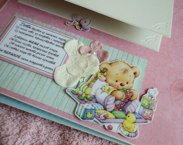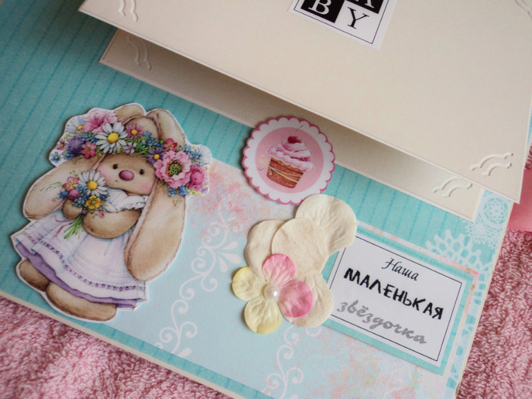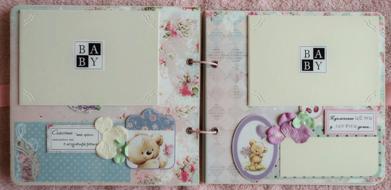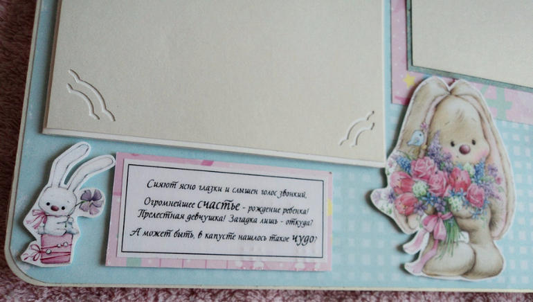 Альбомы ДетскиеОчаровательный альбомчик для маленькой Ариночки с чудесными зайками и мишками (автор картинок - Марина Федотова) . Формат 21*23 см, 6 разворотов, вмещает около 40 фото, есть табличка для записи данных при рождении, табличка рост-вес, места для записей, стишки. Нежная конфетка для сладкой девочки)))