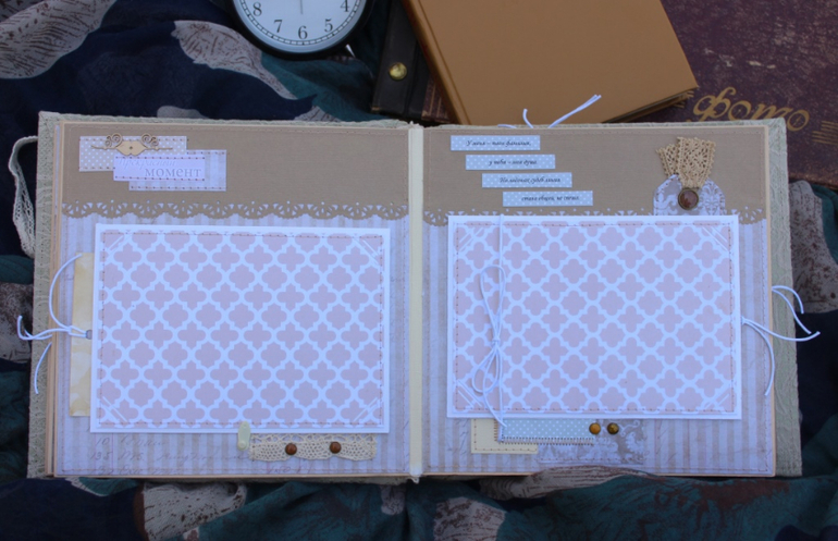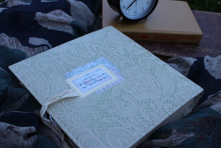 Размер альбома 21*21 (странички 20*20). Для обложки очень долго искала "достойную" ткань и остановилась на этой - жаккард. Вмещает 39 фото 10*15 (на всякий случай имеются карточки для записи - спрятаны под фото - их "выдают" веревочки).