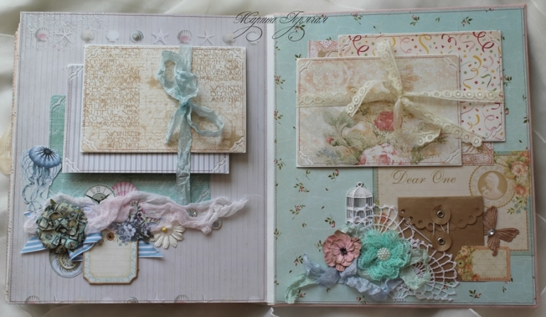 И последний разворот - с морской страницей. Долго я думала, насколько эта страница будет уместна в таком альбоме...Но учитывая то, что на ней будут фотографии с первой поездки малышки на море, думаю, она просто должна здесь быть!)))