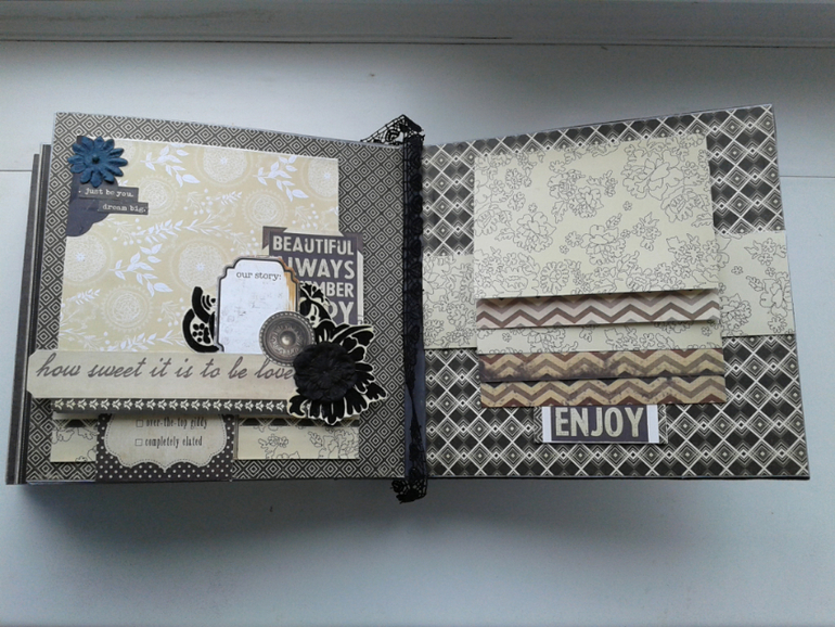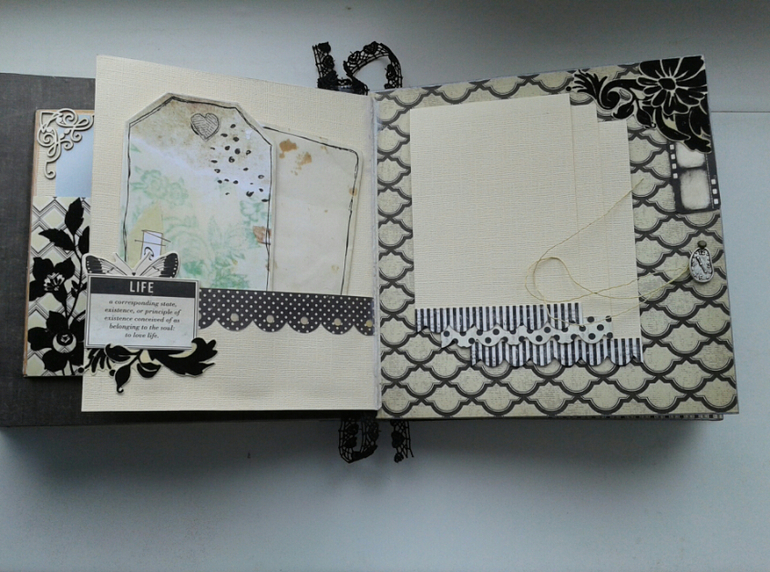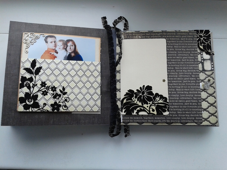 В нем действительно огромное количество разных интересностей )) и вес у него тоже солидный) Альбом делала в ч/б гамме ( моей любимой) Долго думала над обложкой, в итоге сделала комбинированной : лицевая сторона бумажная, корешок и спинка тканевые. Изначально планировала что верхняя часть лицевой стороны будет просто серой, но маленький человечек приложил свои маленькие сладкие ручки к уже готовой обложке. Пришлось маскировать отпечатки )) Дальше фото