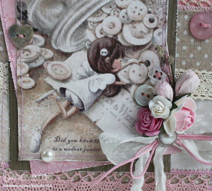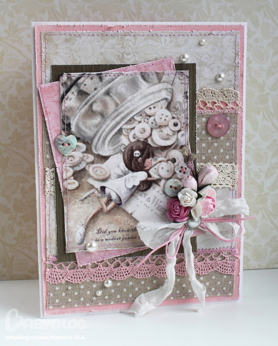 Открыточка не маленькая получилась 14х19 см.Акварельная бумага, кардсток с внутренним слоем, кусочки от Melissa Frances, Echo Park, Crate Paper, шебби лента, вощёный шнур, льняная ткань в горошек, хлопковое кружево,тычинки из микробисера, полужемчуг в компании с жемчужным брадс и конечно пуговки...