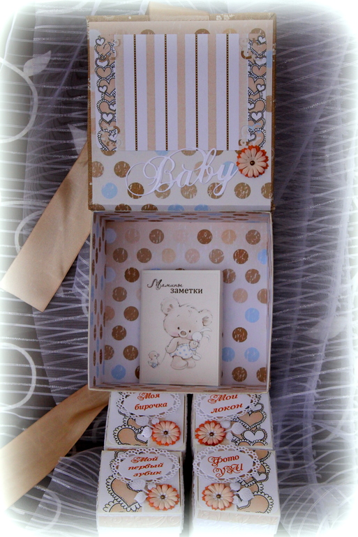 Были сделаны на заказ) Размер внутренних коробочек 7х7, мягкая тканевая крышка, так же в комплект входит мини блокнот для маминых заметок. Коробочку заказали для мальчика, но в бежевых тонах.