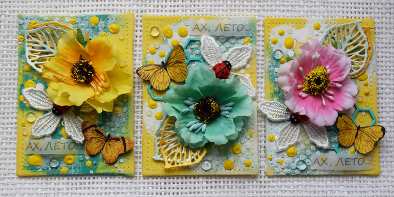 Итак, серия "АХ, ЛЕТО..." состоит из трёх штук. Для создания использовала ткань, текстурную пасту, акриловую краску, вырубку, чипборд, кружево, цветочки, кальку... Кто заинтересовался и готов к обмену, добавляем свои комментарии :)