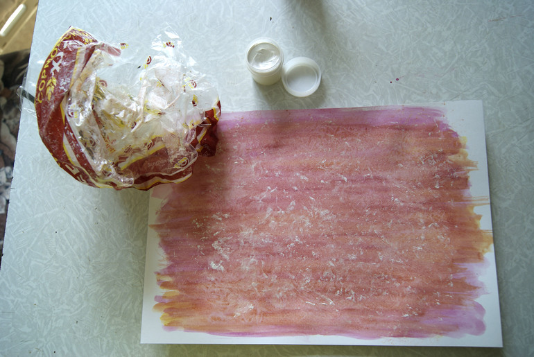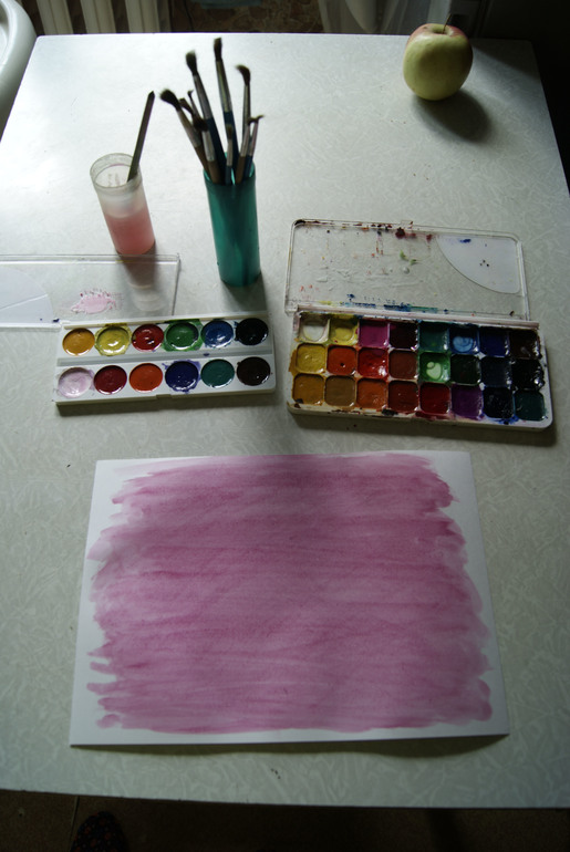 В общем взяла у сынули лист чертежной бумаги, акварельные краски, гуашь и приступила. Сначала фон акварелькой