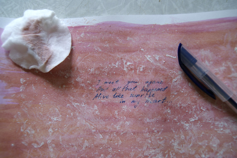 Вместо штампа гелевая ручка и ватный диск и свободное изложение романса я встретил вас на английском, типа так загадочней...