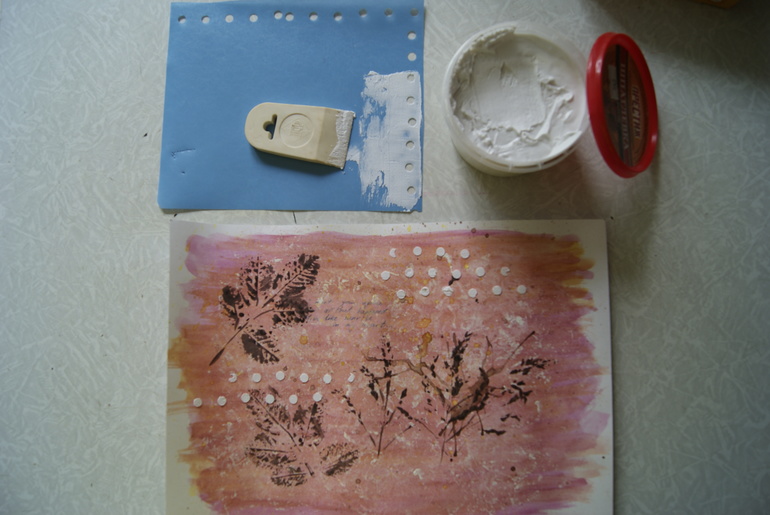 Вместо трафарета задняя часть от папки для документов продыроколенная дыроколом, вместо пасты шпаклевка по дереву, вместо мастихина соответственно шпатель...