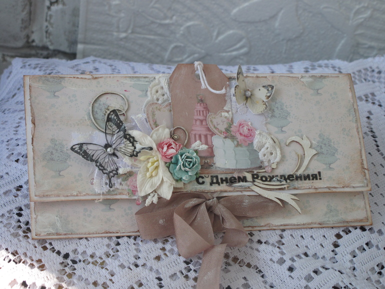 Конверты и коробки для денегВсем доброе время суток! Хочу показать конвертик для моей подруги, у нее сегодня День Варенья. В наше время одним из предполчительнейших подарков считаются денежки, вот и сотворила с утра конвертик, кстате, она очень любит тортики (и это не смотря на осиную талию-везет же!!).