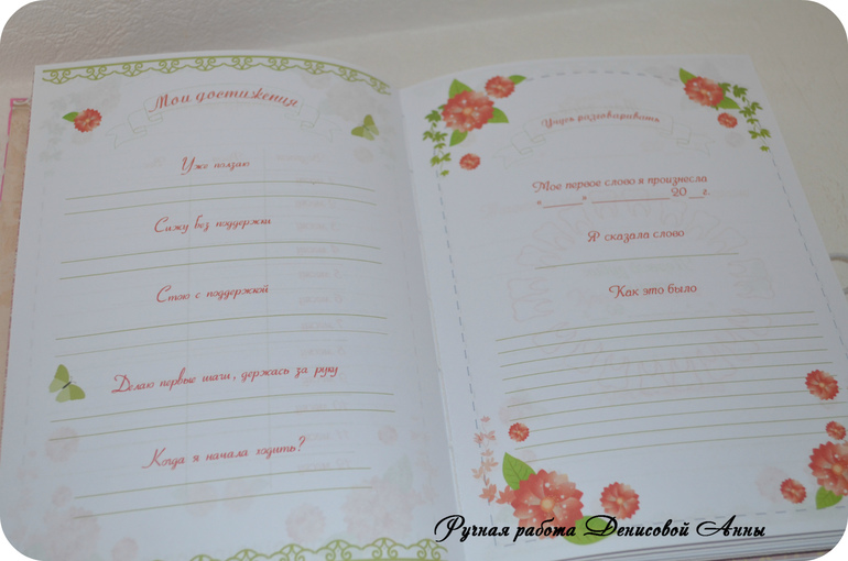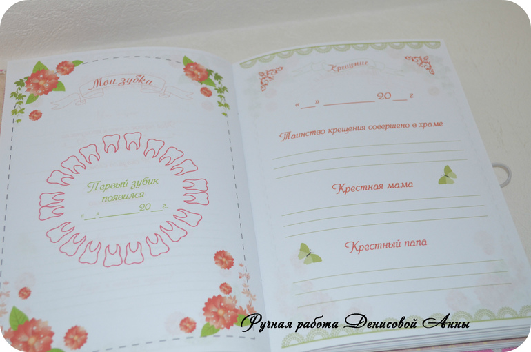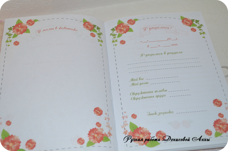 БлокнотыЗдравствуйте! Хочу предложить вашему вниманию мамин дневничок для записей достижений малышки первого года жизни. Блокнотик формата А5, полностью сделан с нуля, мягкая обложка, закладка в виде акриловой коляски на вощеном шнуре, на обложке сделана рамочка для фото малышки. В дневник нужно вносить данные о рождении малышки, график появления зубов, график веса и роста, первые слова, первый НГ, первый ДР, крещение и т.д Есть места для 23 фотографий, кармашек для бирочки и первого УЗИ. Всего в дневничке около 50 листов. Делала на заказ, с радостью могу повторить. Больше работ и более подробно дневничок можно посмотреть в моей группе http://vk.com/club77700048