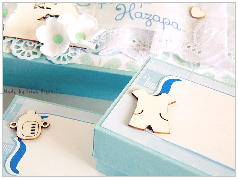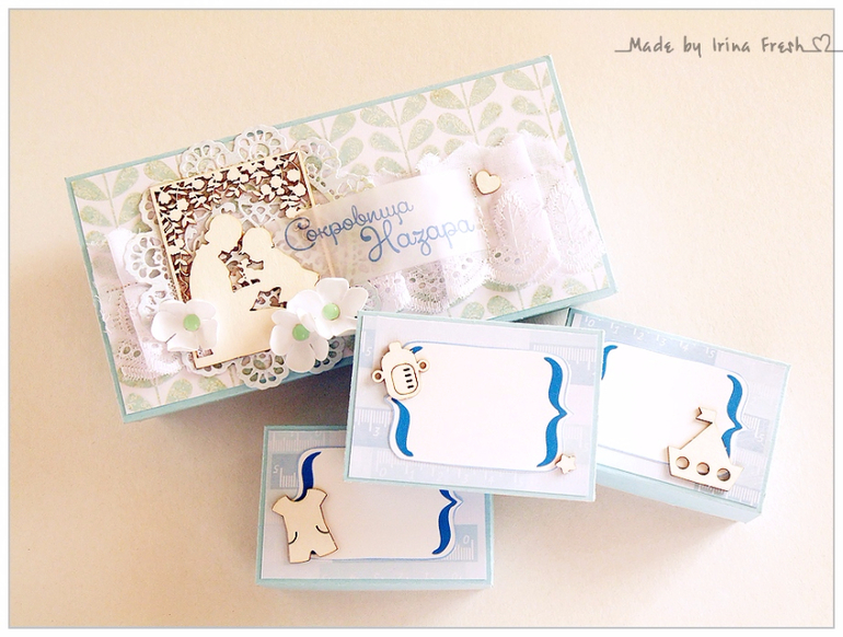 Покажу наборчик-сокровища для малыша Назара (подарок от крёстной мамы). Очень старалась сделать набор нежным и светлым. Основа коробочек из плотного кардстока, оклеена бумагой для скрапа. Декор: чипборд, хлопковое шитье, кружевная вырубка и рукотворные цветочки.